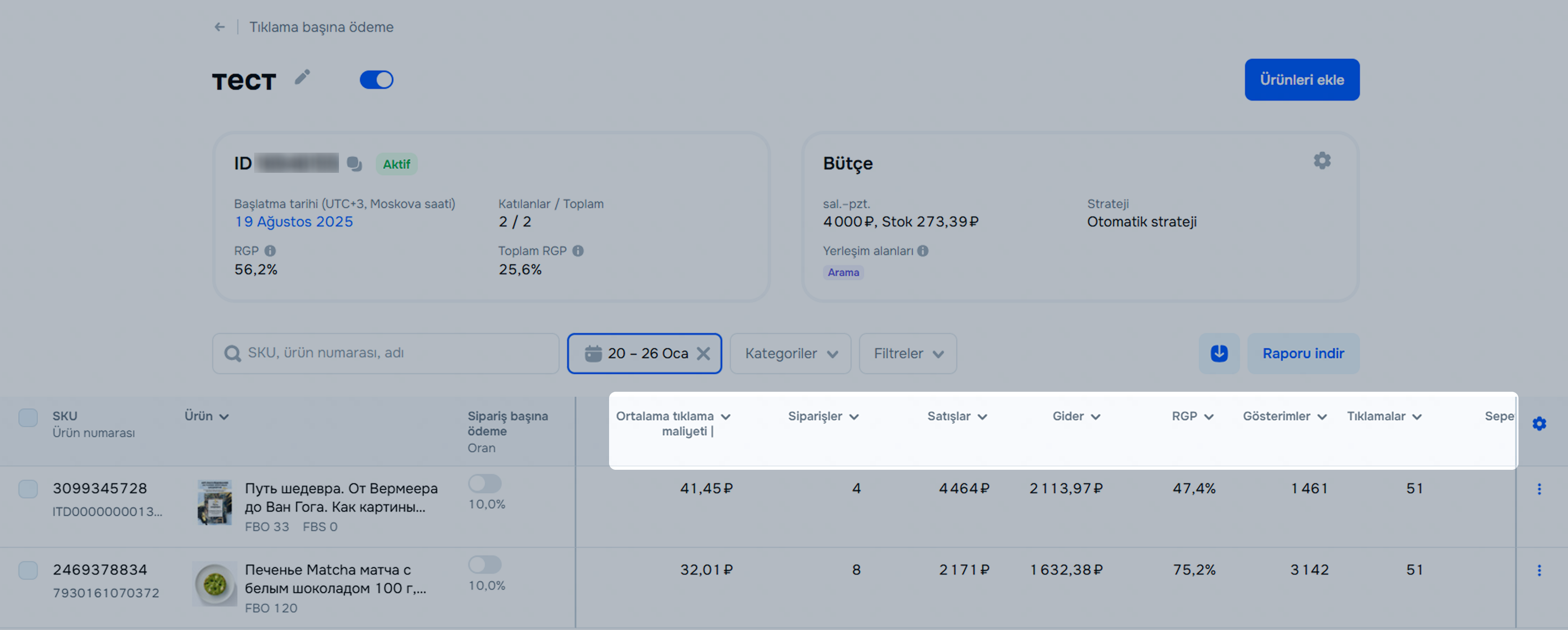 - Tanıtım → Tıklama başına ödeme bölümünde, kampanya sayfasındaki Raporu indir’e tıklayın ve “Model siparişleri” sütunundan verileri görüntüleyin.