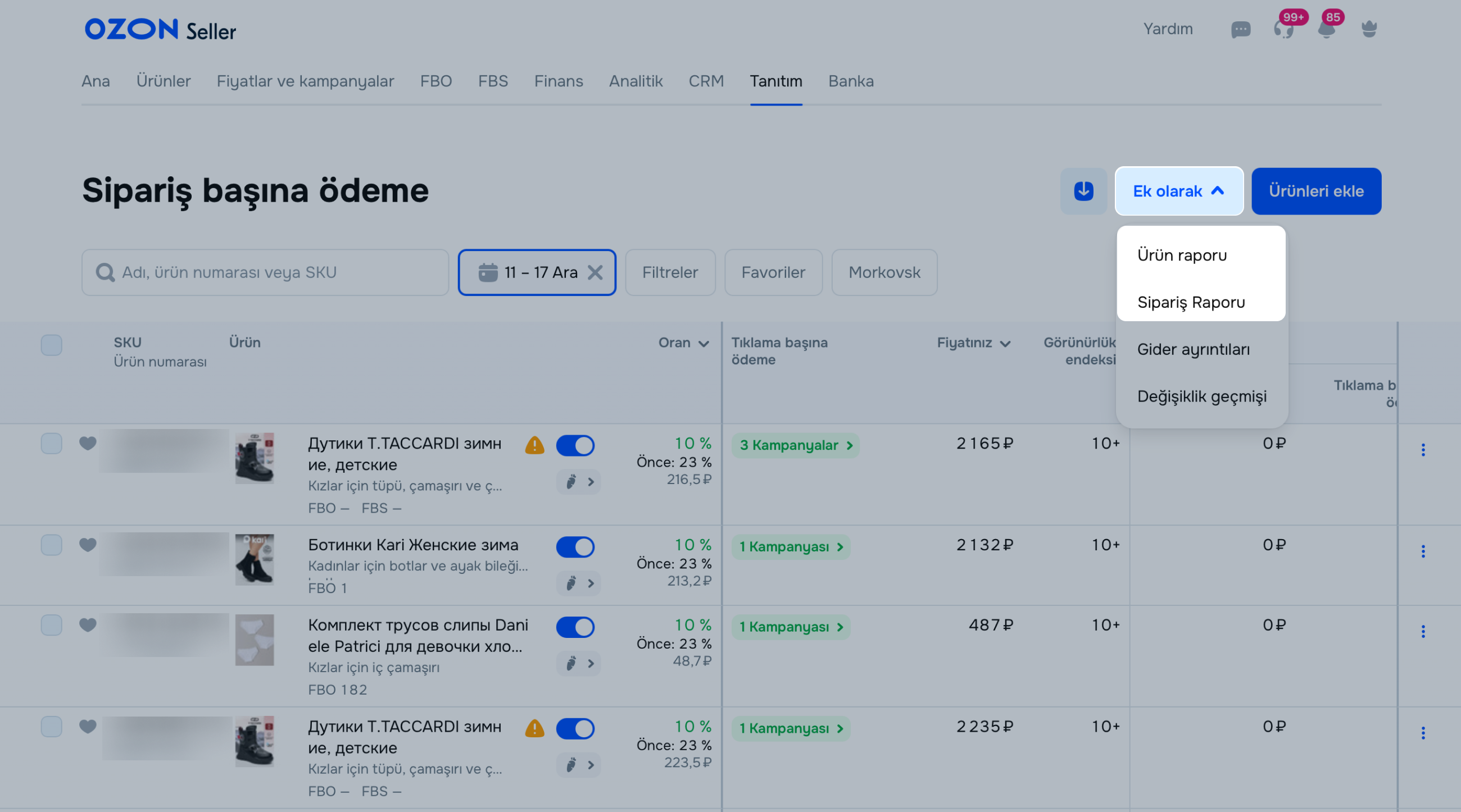 Ek olarak seçeneğine tıklayın ve rapor türünü seçin: Ürün raporu veya Sipariş raporu.