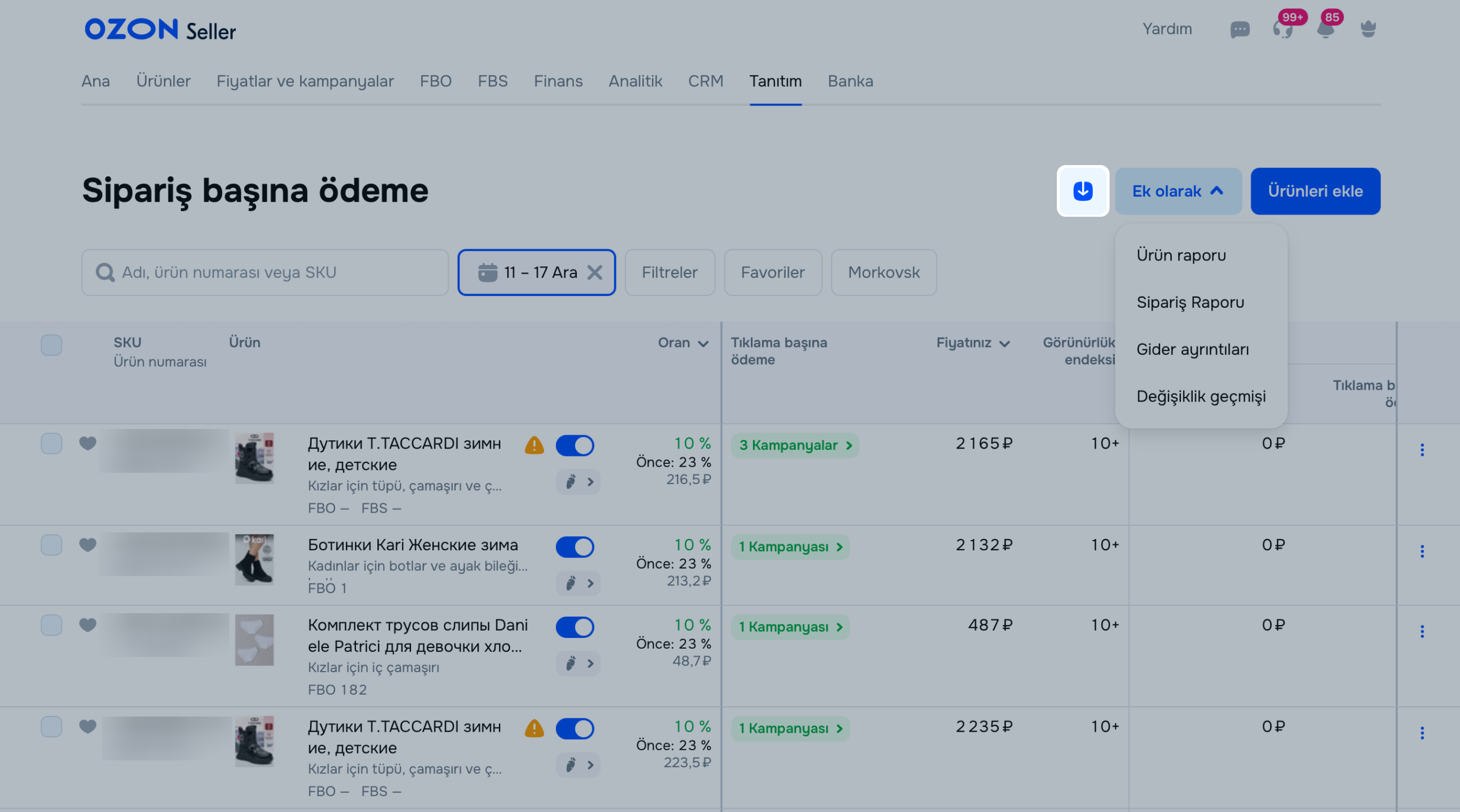 - Tıklama başına ödeme: Ürünün tanıtım harcamalarıdır. Bu harcamalar, tıklama başına ödeme yapılan kampanyaları etkinleştirdiyseniz ürünün sipariş başına ödemeli kampanyaları devam ettiği sürece eş zamanlı tanıtımın neticesinde elde ettiğiniz ürün satışlarının belirli bir yüzdesine karşılık gelir.