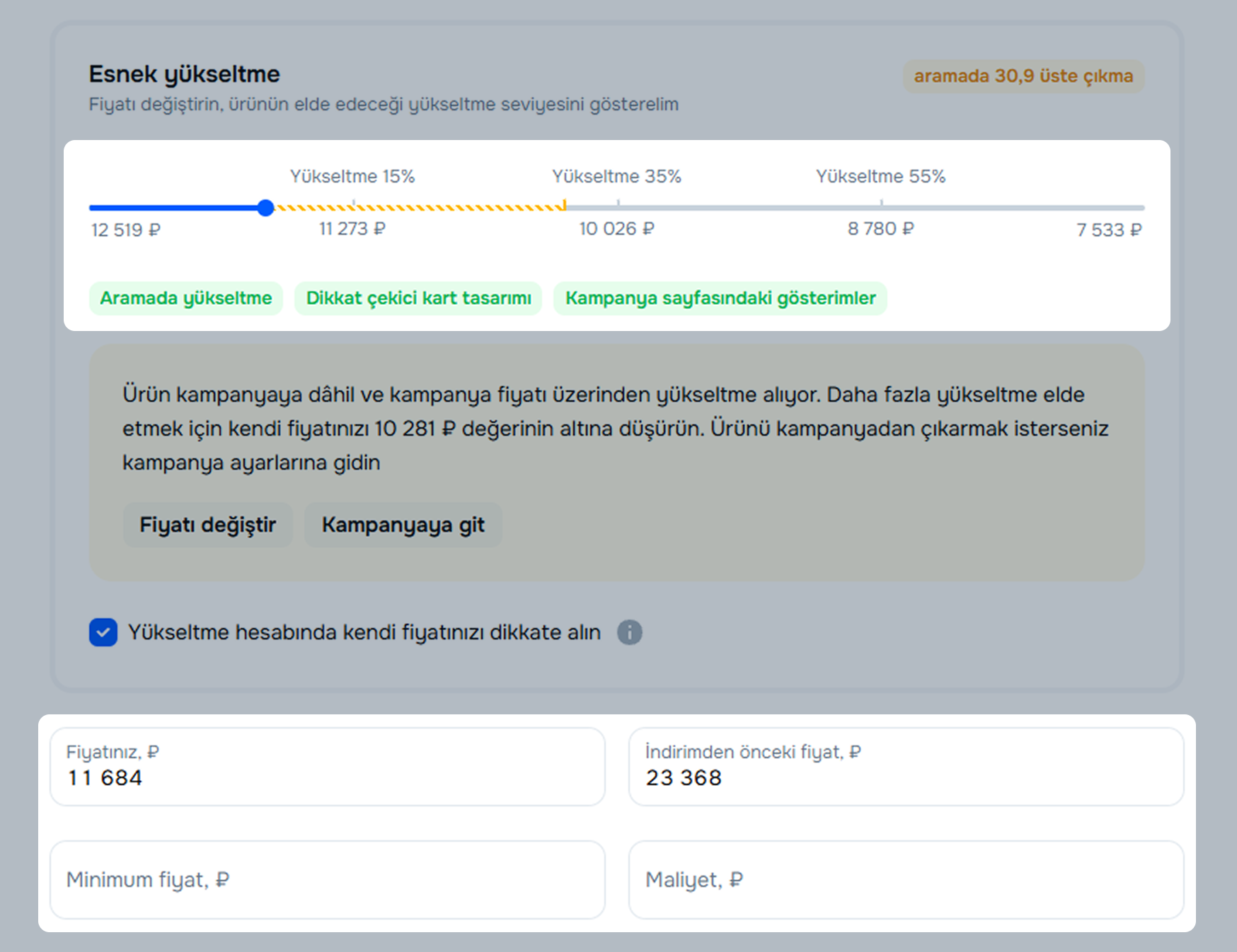 İndirimi ve fiyatı değiştirirken yükseltme miktarı sütunlarındaki minimumdan maksimuma fiyat limitlerine odaklanın. “Kampanya yükseltmesi” sütunundaki skalada, belirleyeceğiniz fiyatla ne kadar yükseltme alacağınızı göstereceğiz.