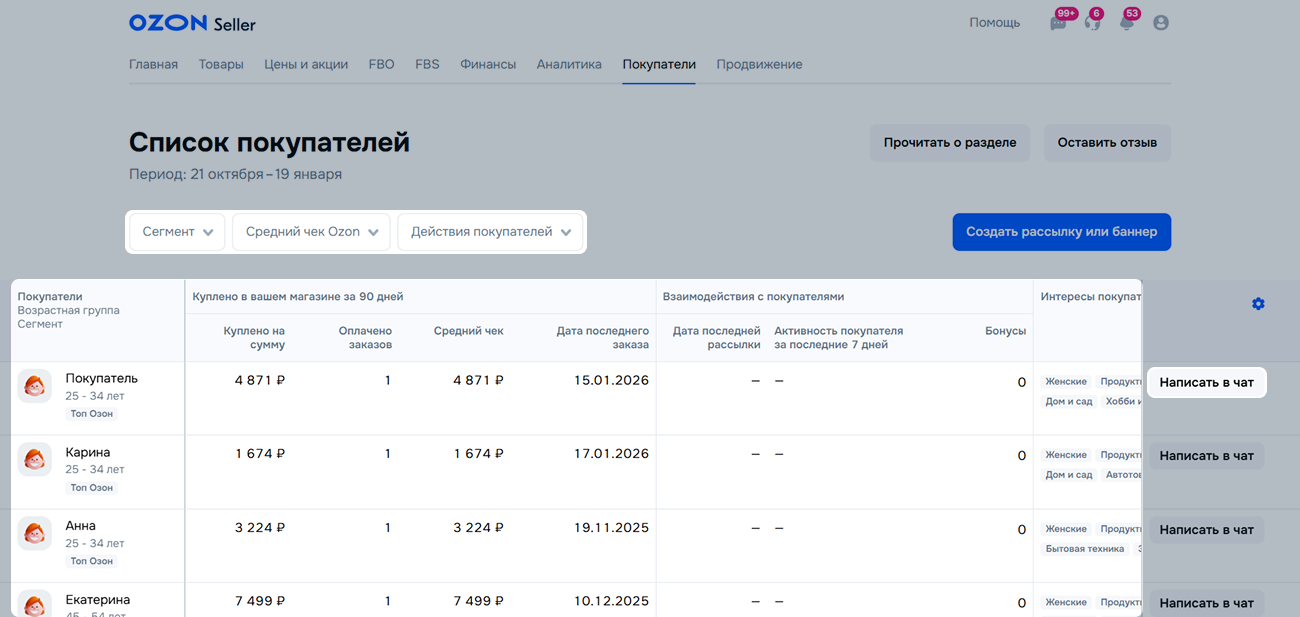 Вы можете отфильтровать покупателей по сегменту, среднему чеку, активности или по дате последней коммуникации.