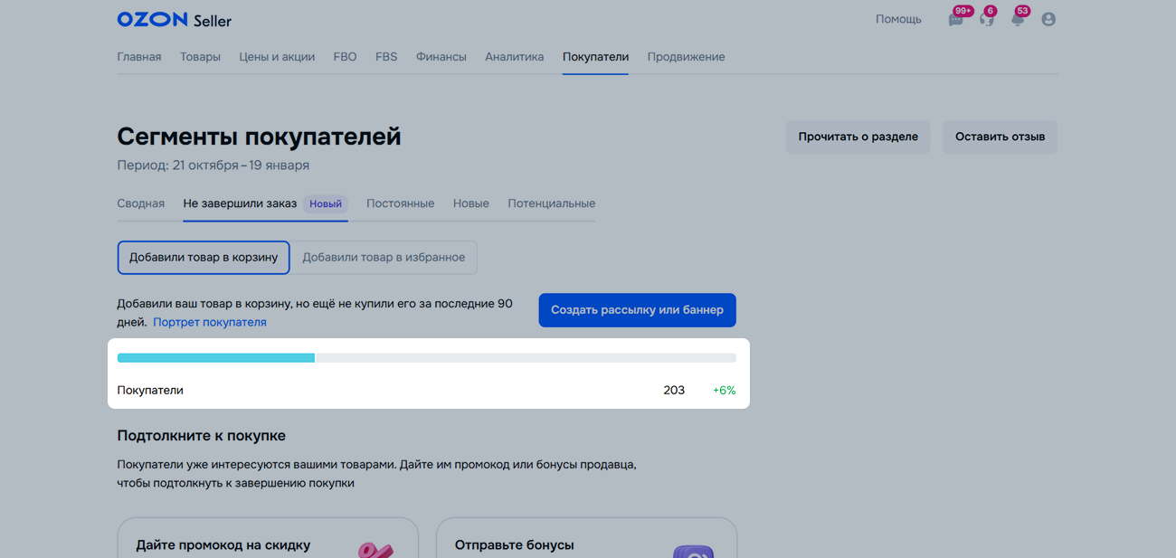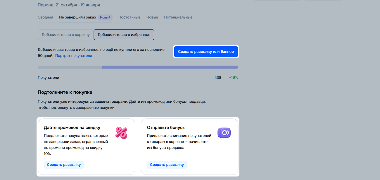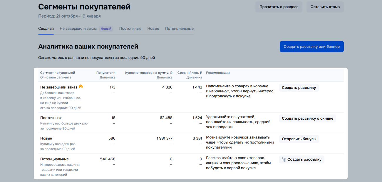 Возможно, у вас будет только один сегмент покупателей или ни одного. Например, вы только начали продавать на площадке и у вас пока мало заказов. Или старые покупатели не возвращались за новыми покупками в течение последних 90 дней. Работайте над удержанием покупателей: предлагайте скидки, бонусы, напоминайте о себе и мотивируйте на покупки. Так вы увеличите прибыль магазина и число лояльных покупателей.