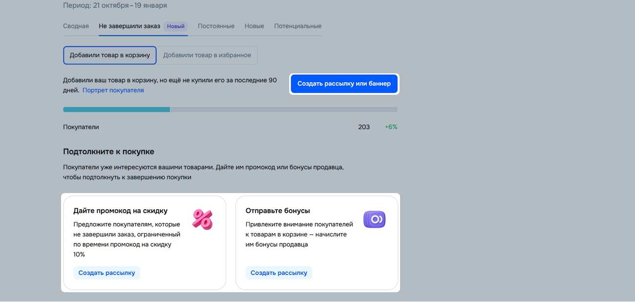 Создание рассылки или баннера — отправьте рассылку для работы с небольшой аудиторией или сделайте баннер, чтобы привлечь внимание большого сегмента покупателей к вашему магазину.
