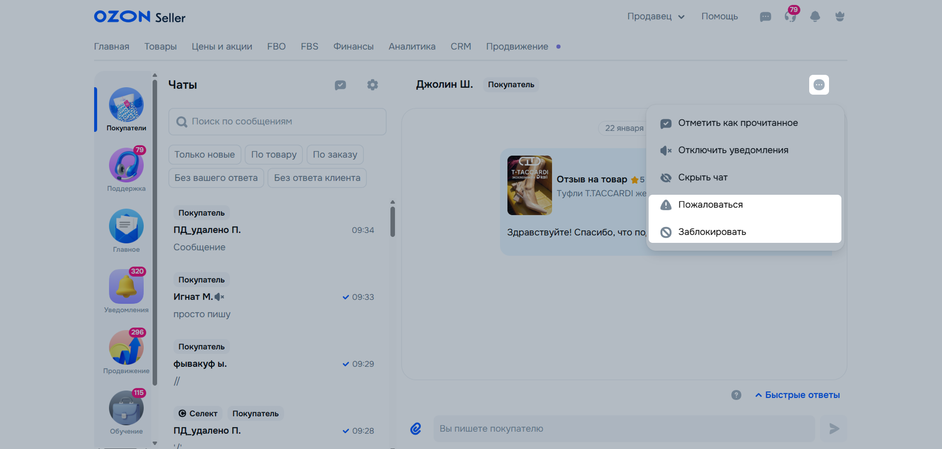 Если покупатель ведёт себя агрессивно, рассылает спам или пытается обмануть, вы можете пожаловаться или заблокировать пользователя в чате.