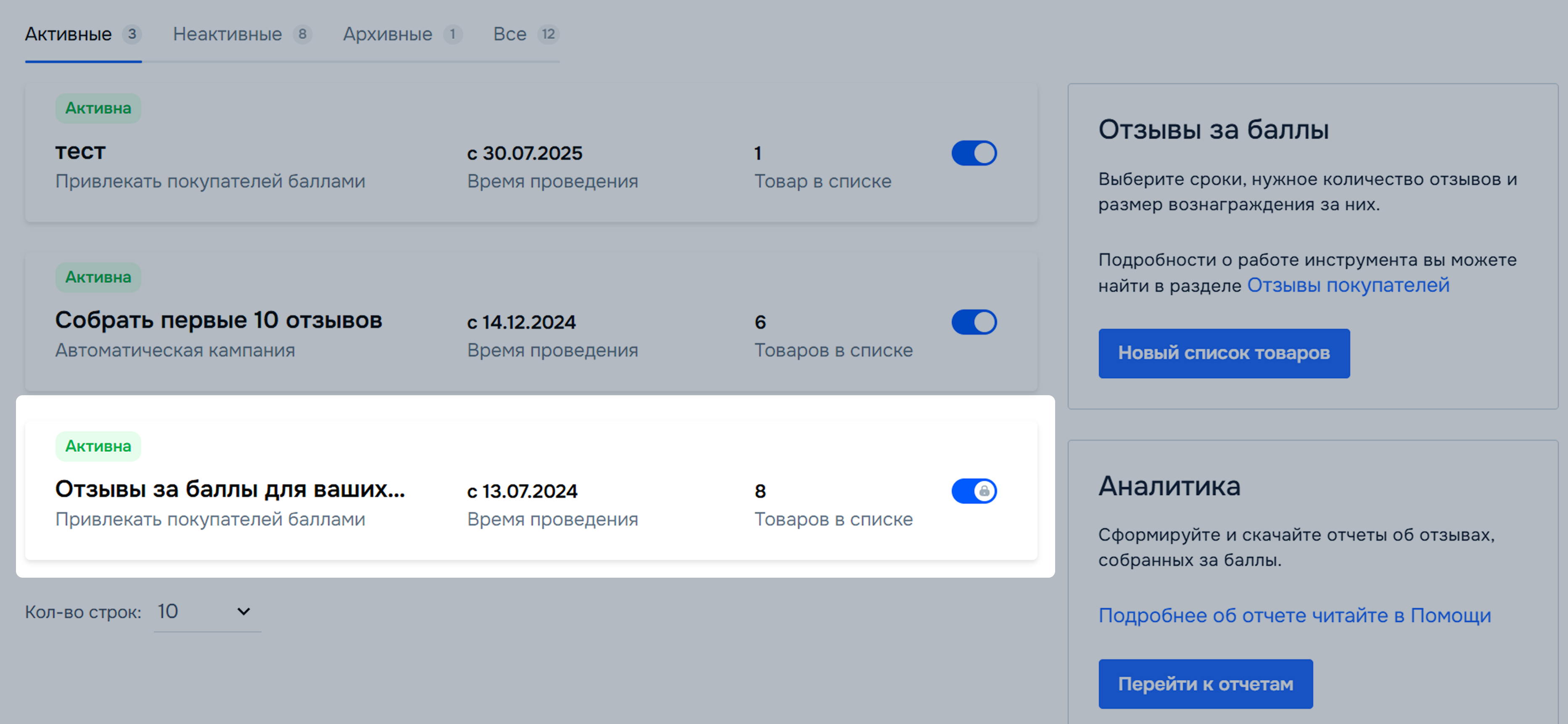 Найдите и откройте кампанию Отзывы за баллы для ваших товаров.