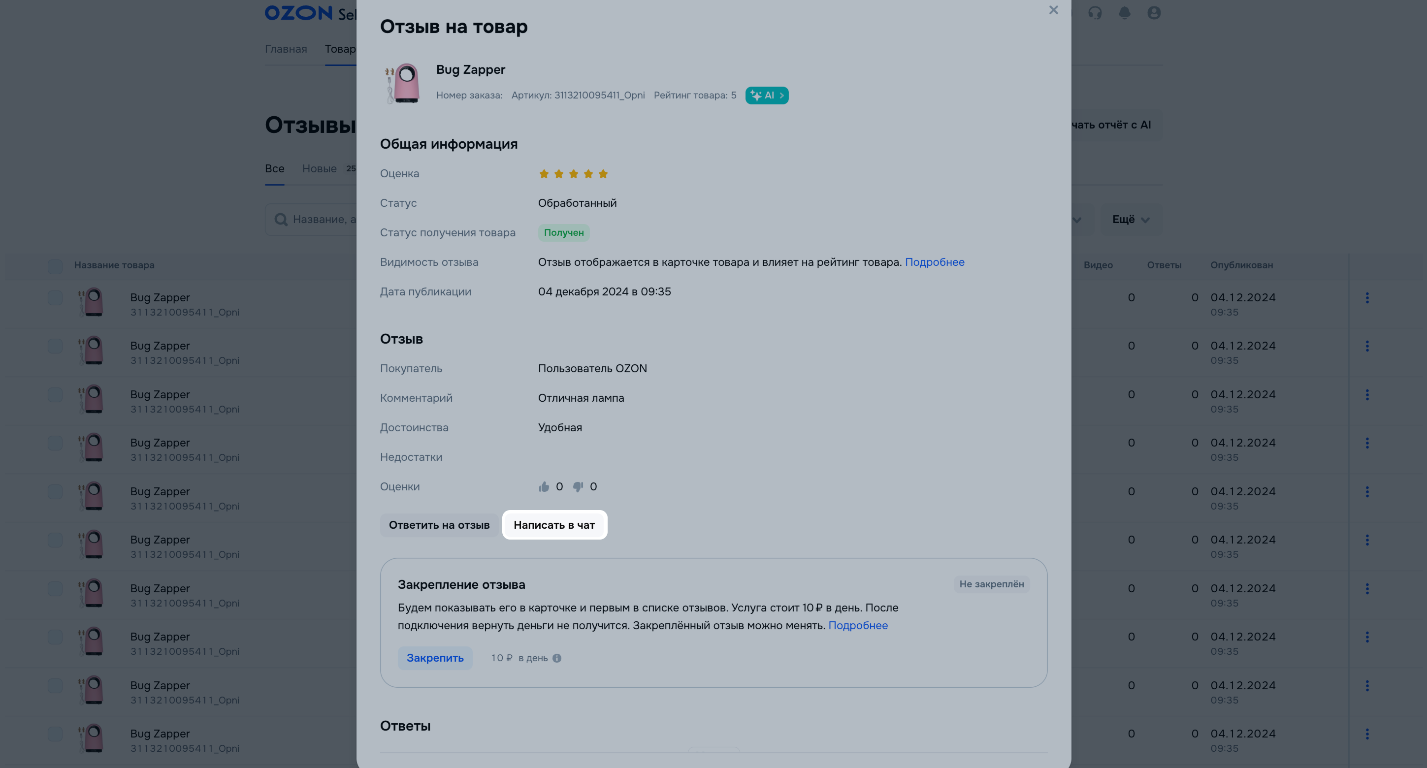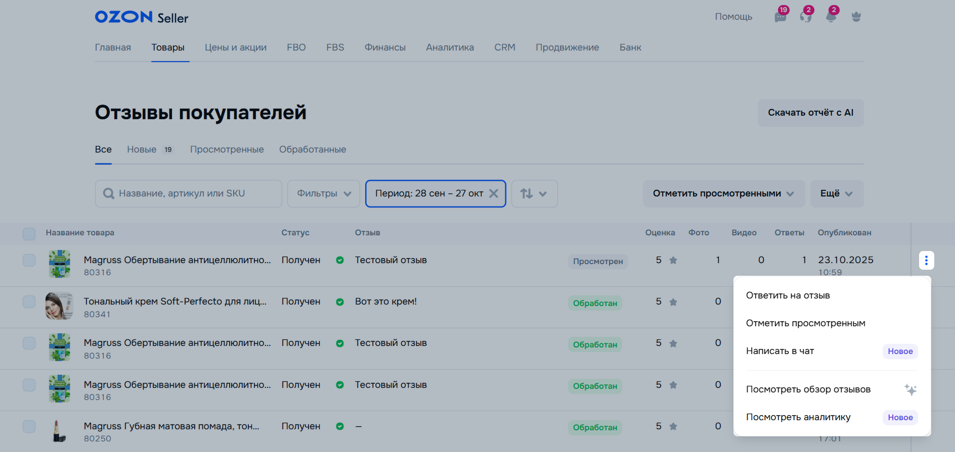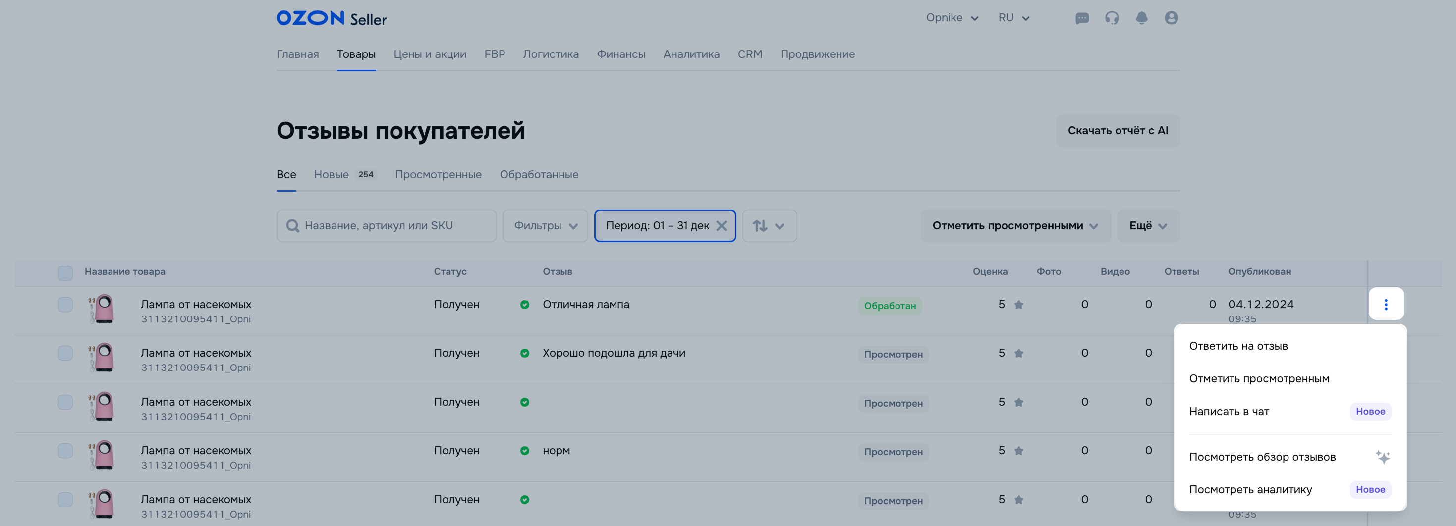 На странице Товары → Отзывы → Отзывы покупателей собраны отзывы о ваших товарах. Здесь можете посмотреть информацию об отзыве, ответить на него, отметить просмотренным, посмотреть обзор отзывов и аналитику, написать покупателю в чат.