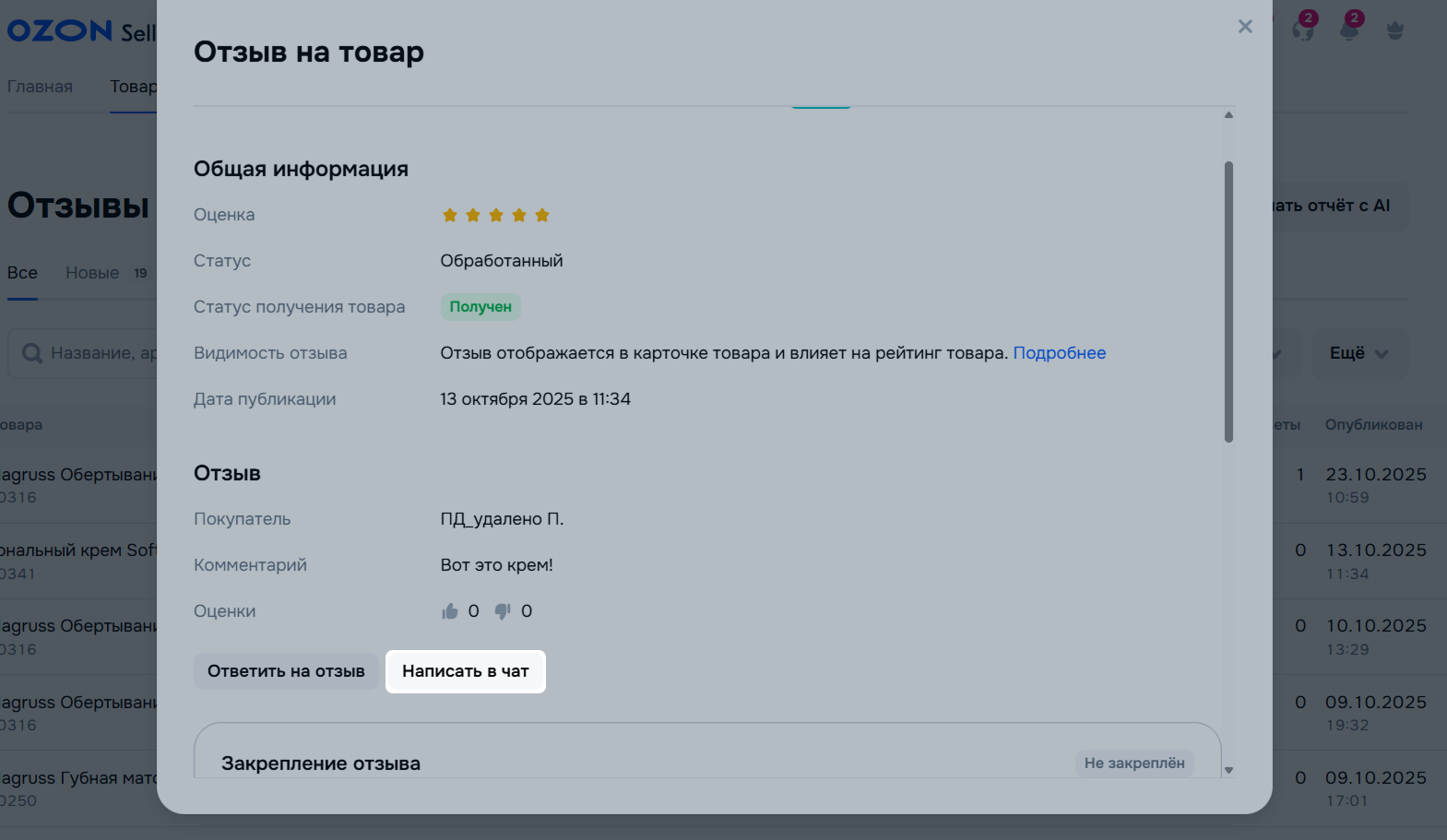В разделе Товары → Отзывы покупателей нажмите на отзыв нужного товара и выберите Написать в чат.