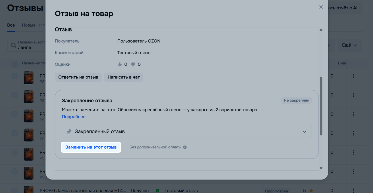 Если захотите закрепить другой отзыв для этого же товара до конца оплаченного периода, Ozon не будет списывать дополнительную плату, а со следующего периода продолжит удерживать её по обычному графику.