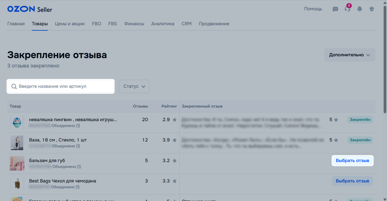 Нажмите Выбрать отзыв рядом с товаром, отзыв на который хотите закрепить.