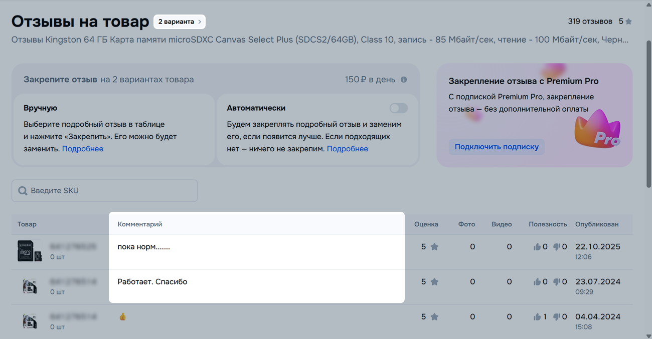 По подписке Premium Pro закрепление отзывов на товары доступно без дополнительной платы в течение срока действия подписки.