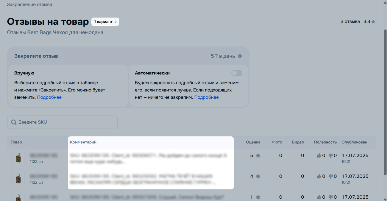 Если у товаров появятся новые полезные отзывы, заменим уже закреплённые нами на новые. Если не найдём у товара полезный отзыв, ничего не закрепим. Вы можете самостоятельно закрепить любой отзыв.