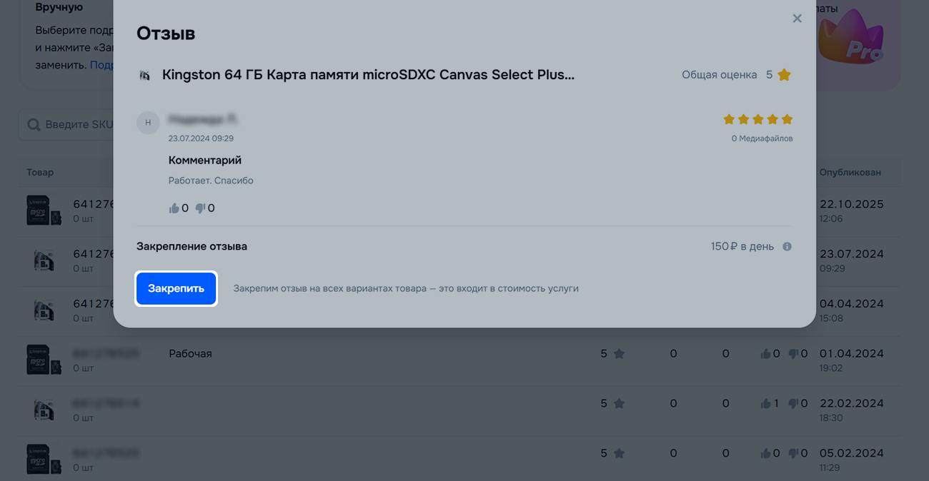 На выбранном товаре и всех его вариантах начнём показывать новый закреплённый отзыв.