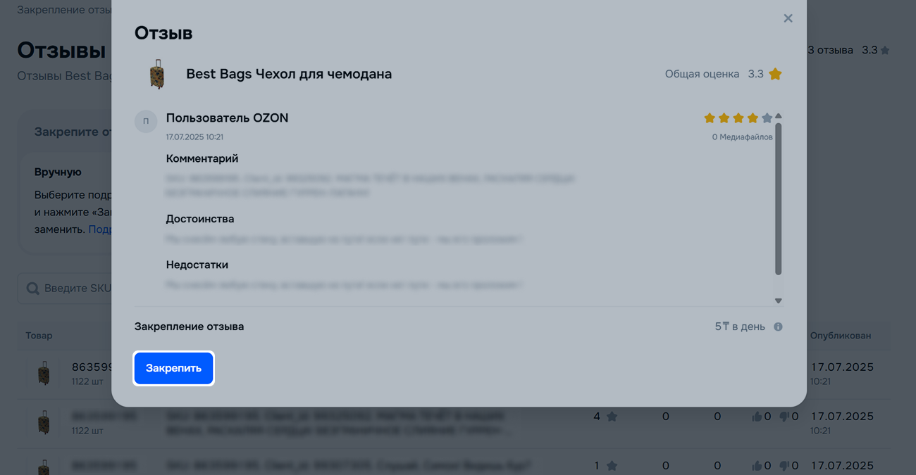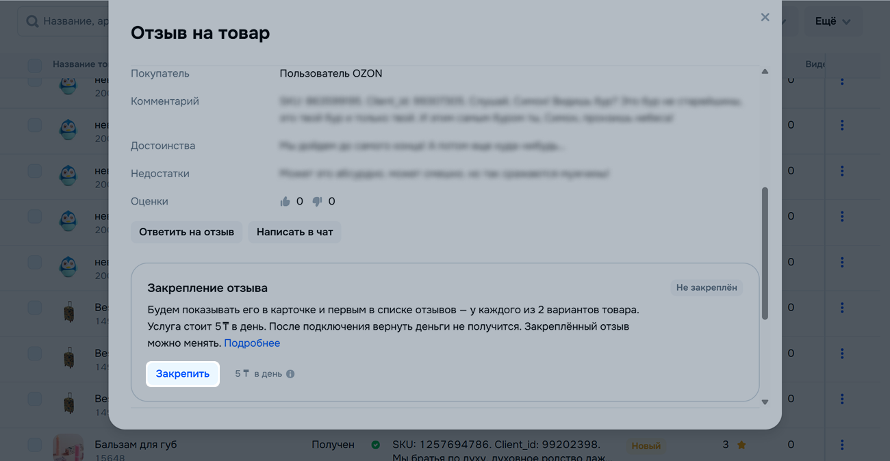 Ozon удерживает плату раз в сутки — за каждый закреплённый отзыв. Если закреплённых отзывов несколько, спишем общую стоимость. При этом отзывы можно менять: дополнительная плата не списывается.