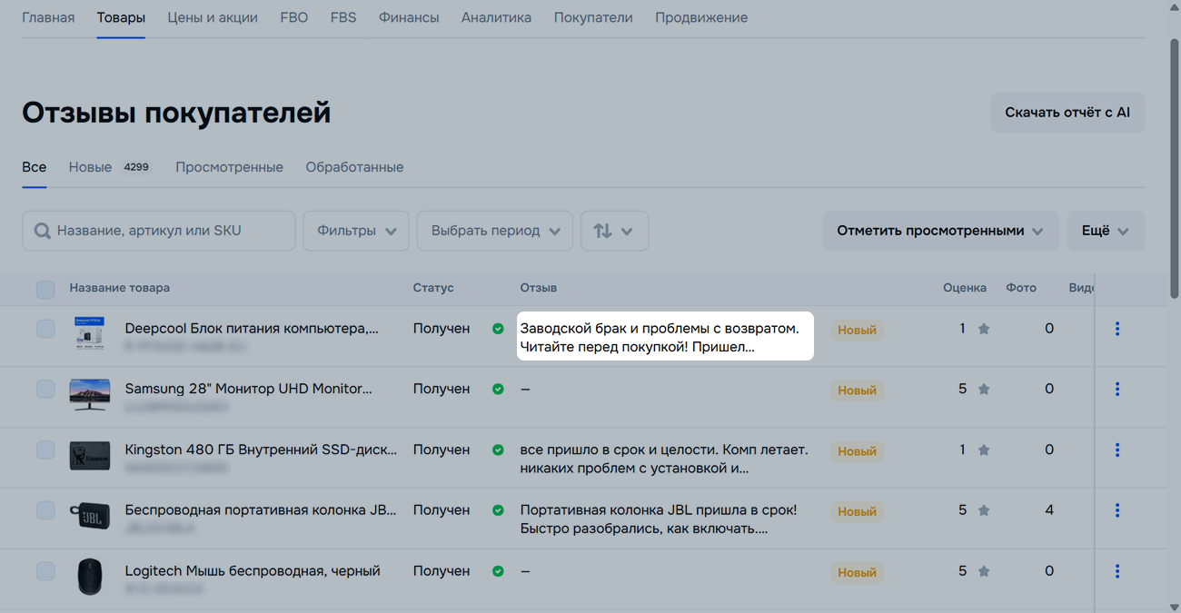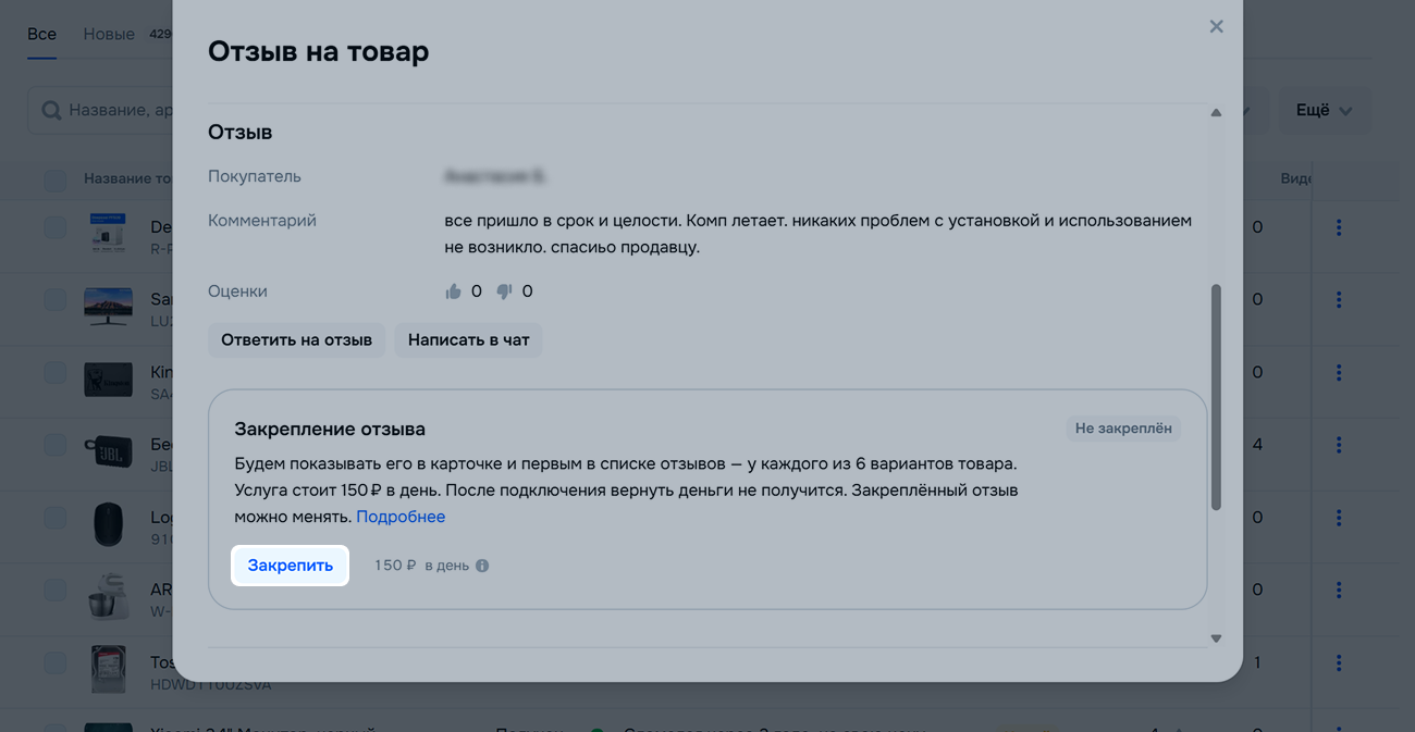 Нажмите на первый отзыв в таблице или блок под названием товара — откроется закреплённый отзыв.
