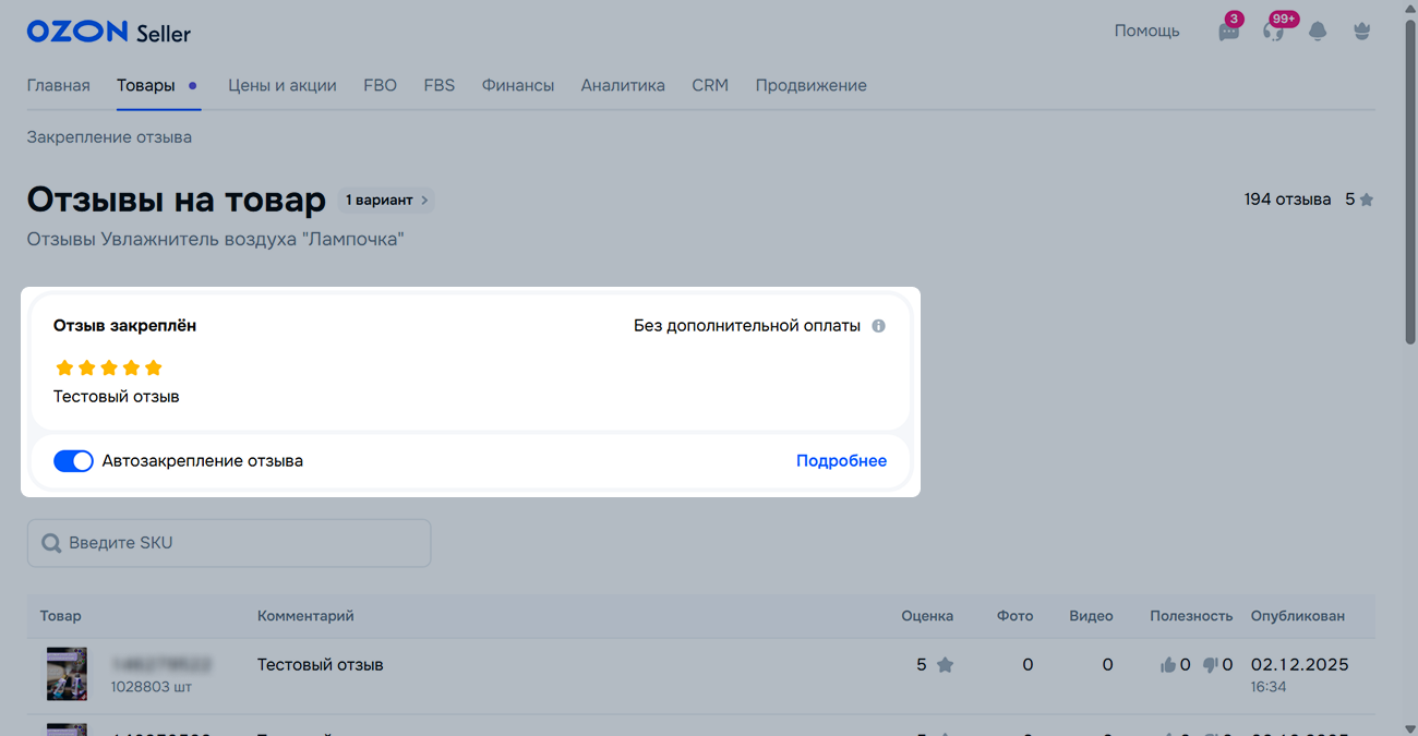 Закрепление отзывов доступно без дополнительной платы с подпиской Premium Pro. Чтобы не платить за автозакреплённые отзывы после окончания подписки, в разделе Товары → Закрепление отзыва нажмите Открепить отзывы и подтвердите действие.