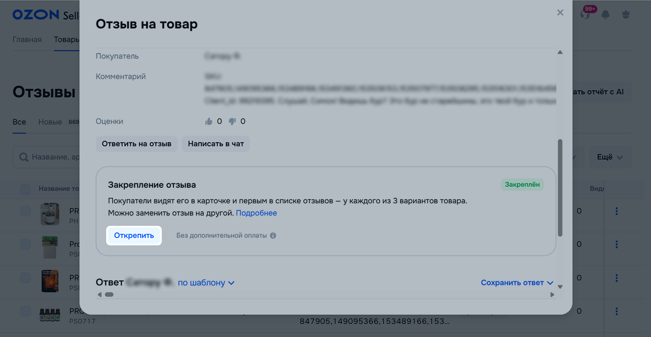 | «Нет закреплённого отзыва» | Вы открепили отзыв — после оплаченного периода Ozon перестанет удерживать плату, и услуга для этого товара перейдёт в статус «Отзыв откреплён». Пока статус услуги не изменился на «Отзыв откреплён», вы можете закрепить другой отзыв без дополнительной платы. |