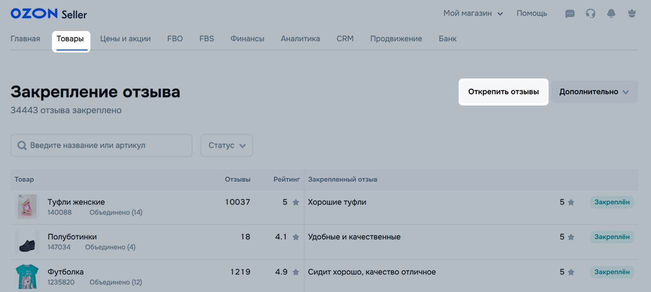 | «Отзыв закреплён» | Отзыв закреплён на карточке товара — услуга активна, Ozon удерживает за неё плату. Можно закрепить отзыв с любой оценкой вне зависимости от рейтинга товара. |