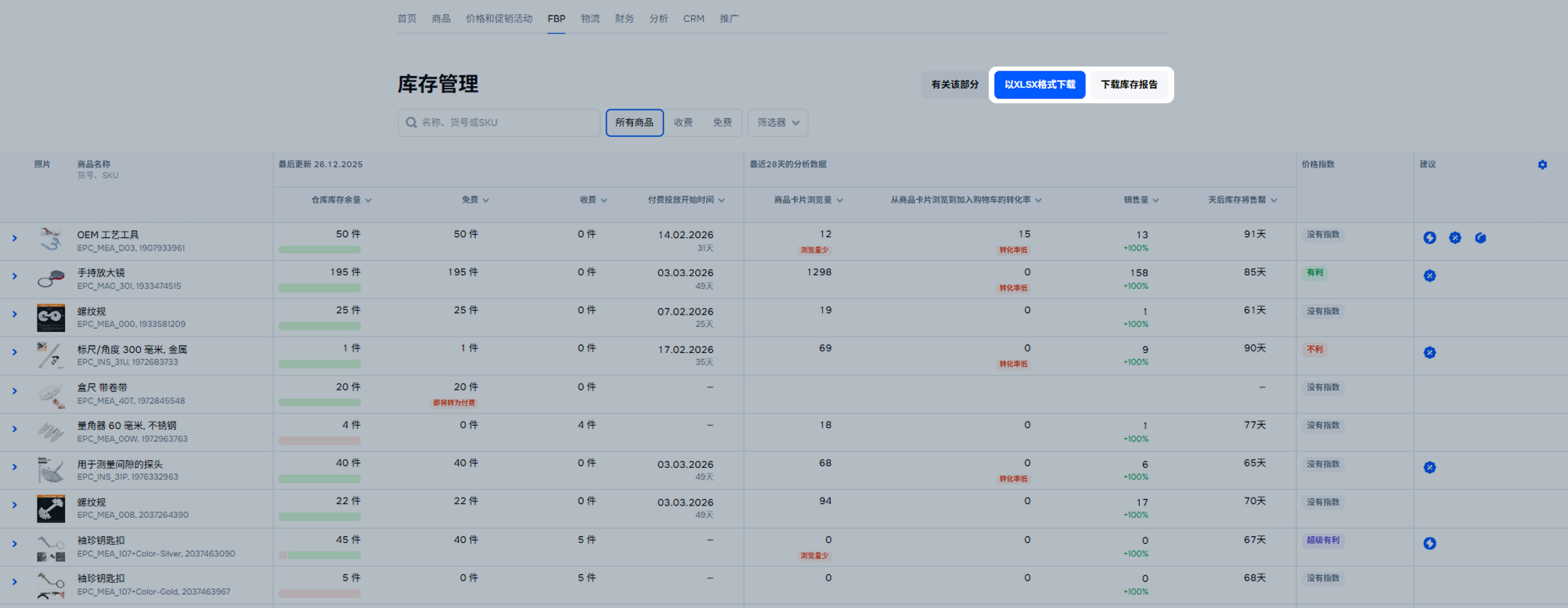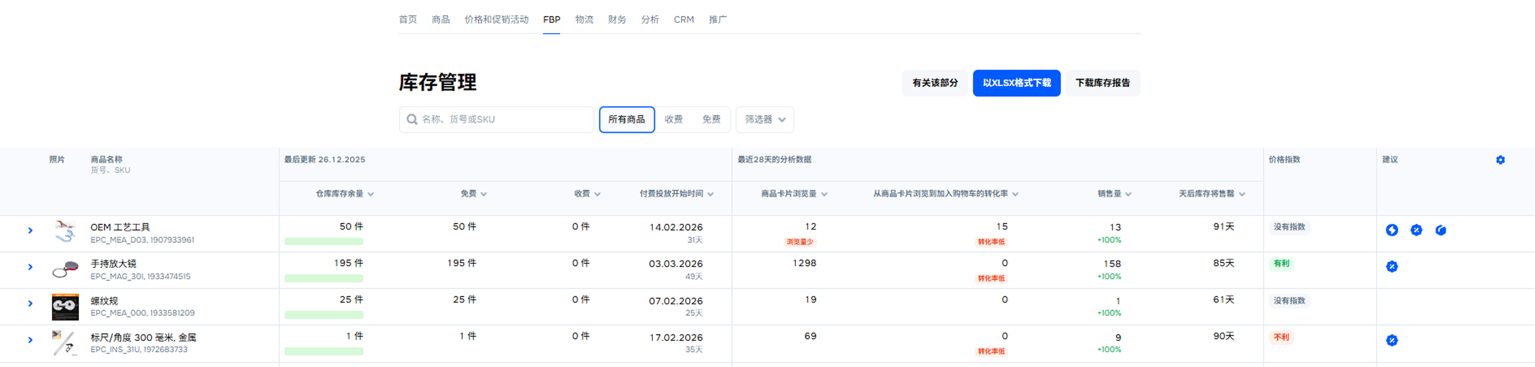 在FBP → 库存管理模块中,我们会展示所有在 FBP 仓库有库存商品的详细信息,帮助您及时决定是否需要运出商品、参加促销活动或设置推广。这有助于降低付费仓储成本,并提升库存周转效率。