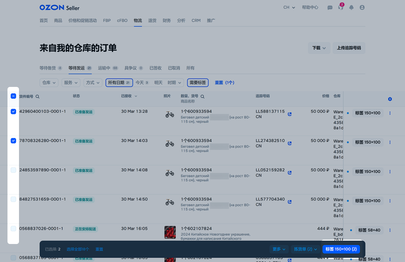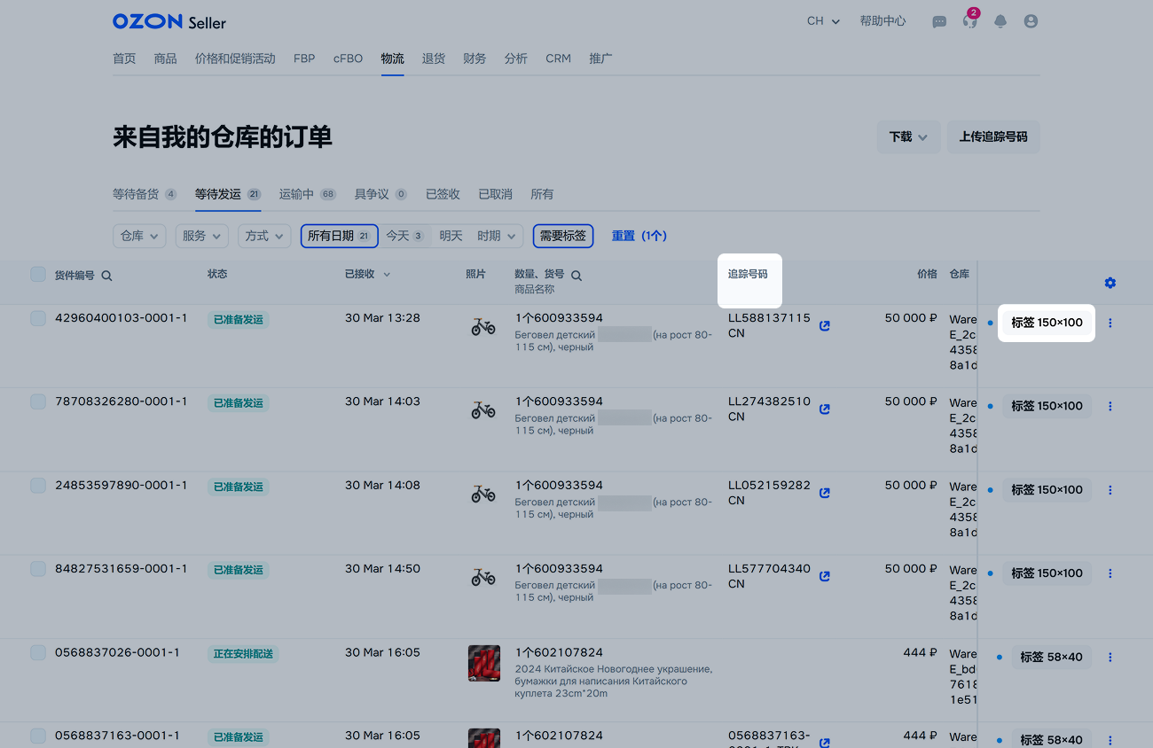 选择 Ozon 合作伙伴配送后,将无法更改追踪号码。