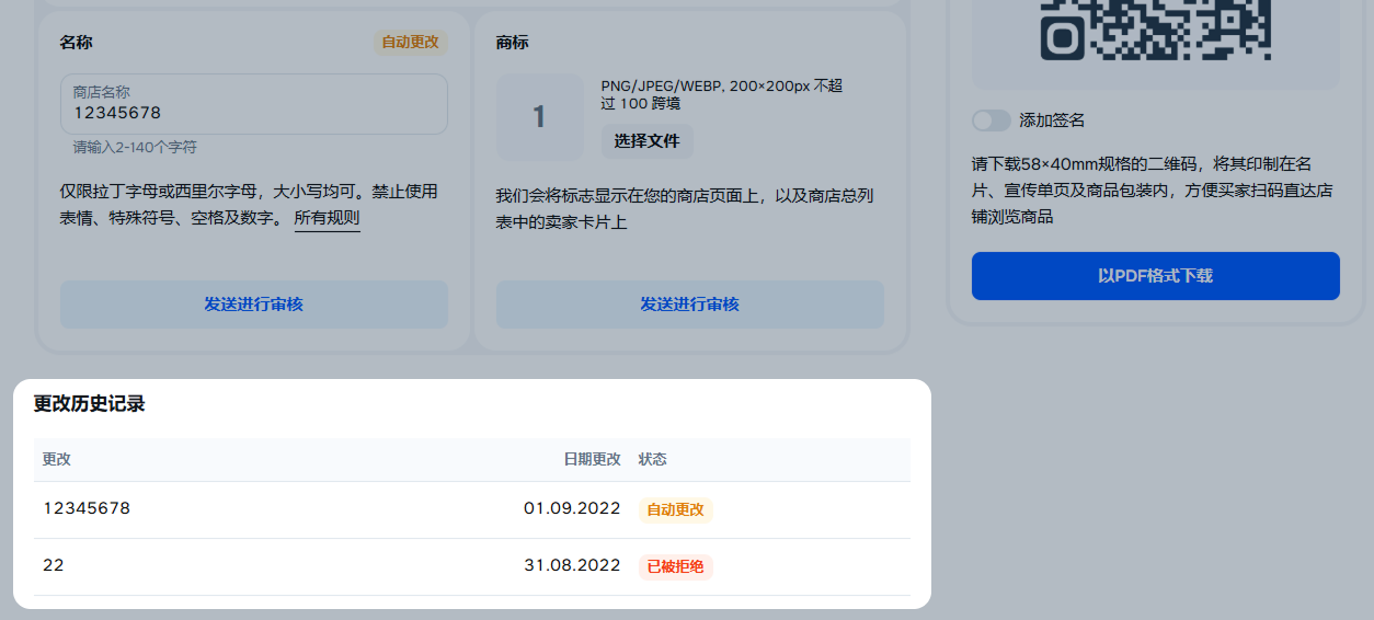 审核人员将在两个工作日内审核您提交的新店铺名称。我们将通过电子邮件通知您审核结果,同时在橱窗数据标签页中显示审核状态。您还可以在更改历史记录模块中查看当前申请状态、旧的店铺名称、以往申请的状态及其审核日期。