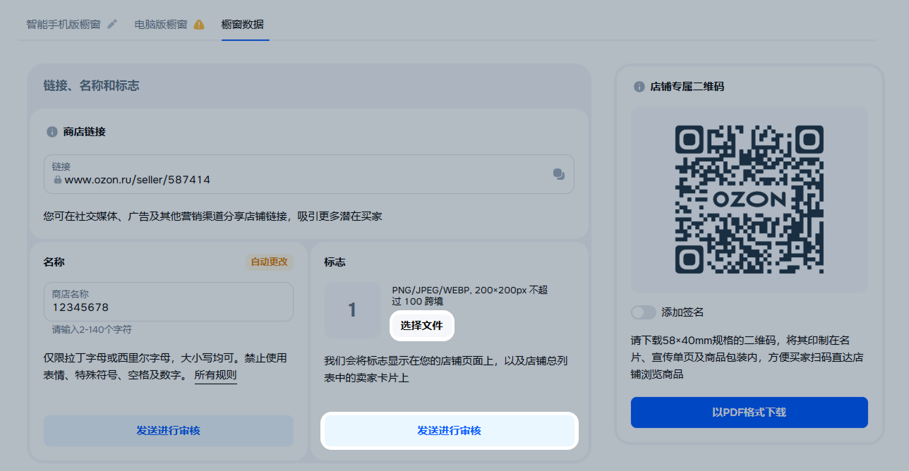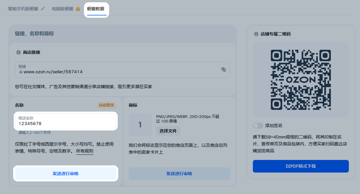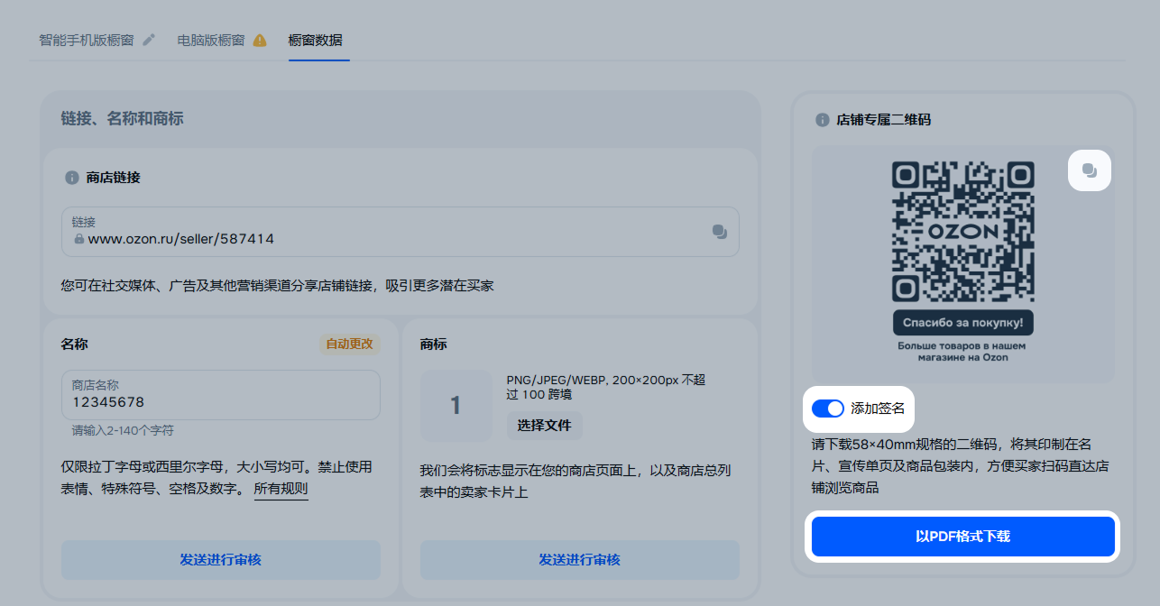 您可以在 Ozon 卖家账户注册时填写店铺名称,或在注册后进入 商品 → 橱窗 → 商店设计页面中进行设置。
