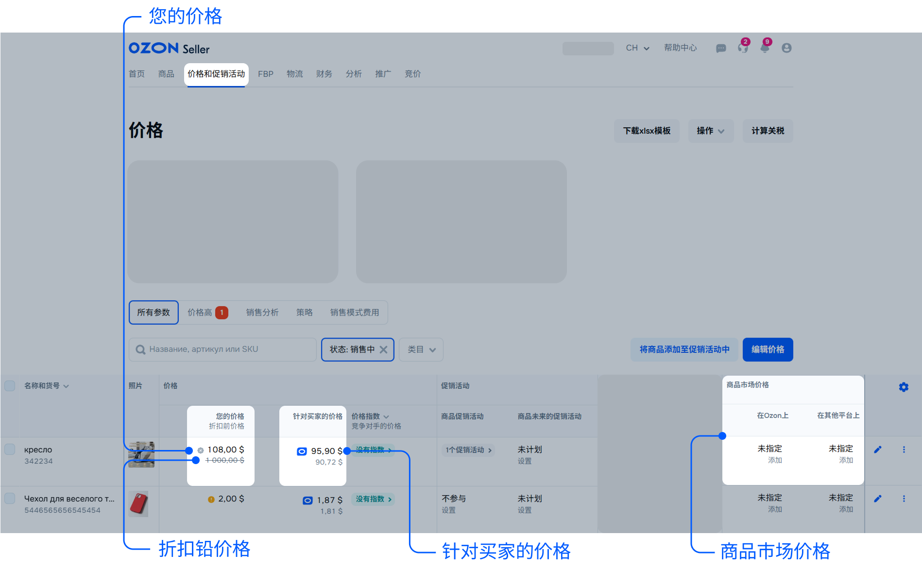 您的价格 — 指您为商品设置的价格,已包含您设定的所有折扣和促销活动,但不包括Ozon额外提供的优惠,如积分折扣等。