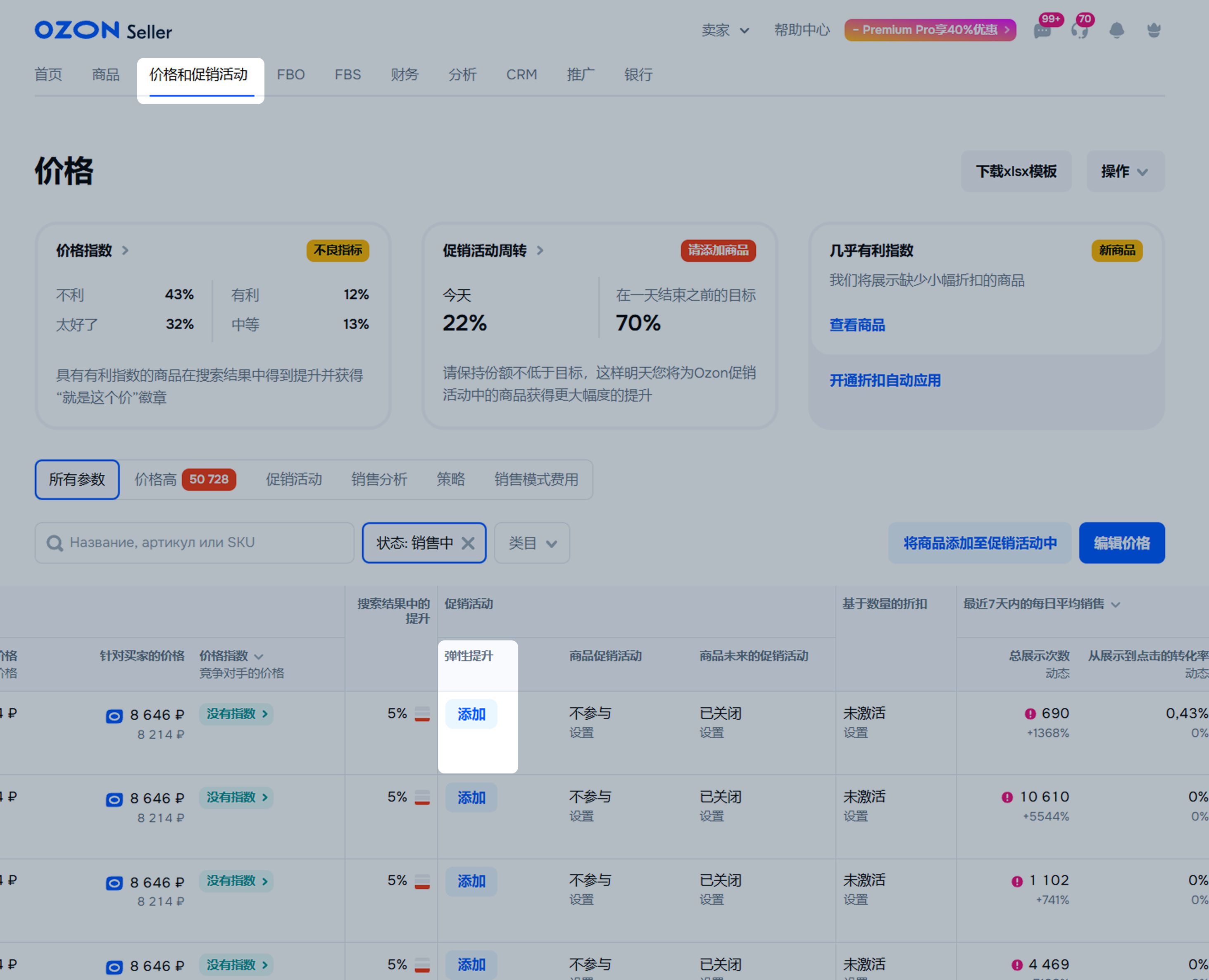 若需在“弹性提升”促销活动中提高商品价格,或移除已参与的商品,可在促销页面的价格和促销 → 来自Ozon的促销活动部分操作。