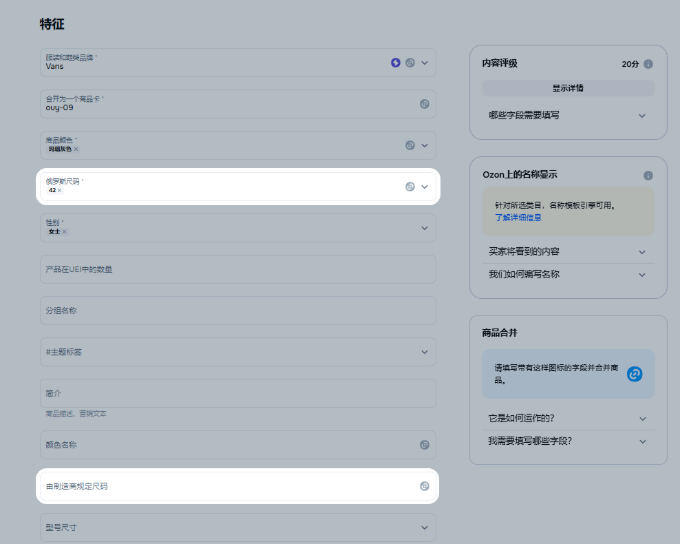 不要在俄罗斯尺码和由制造商规定尺码字段中重复信息,这两个字段的值应当不同。