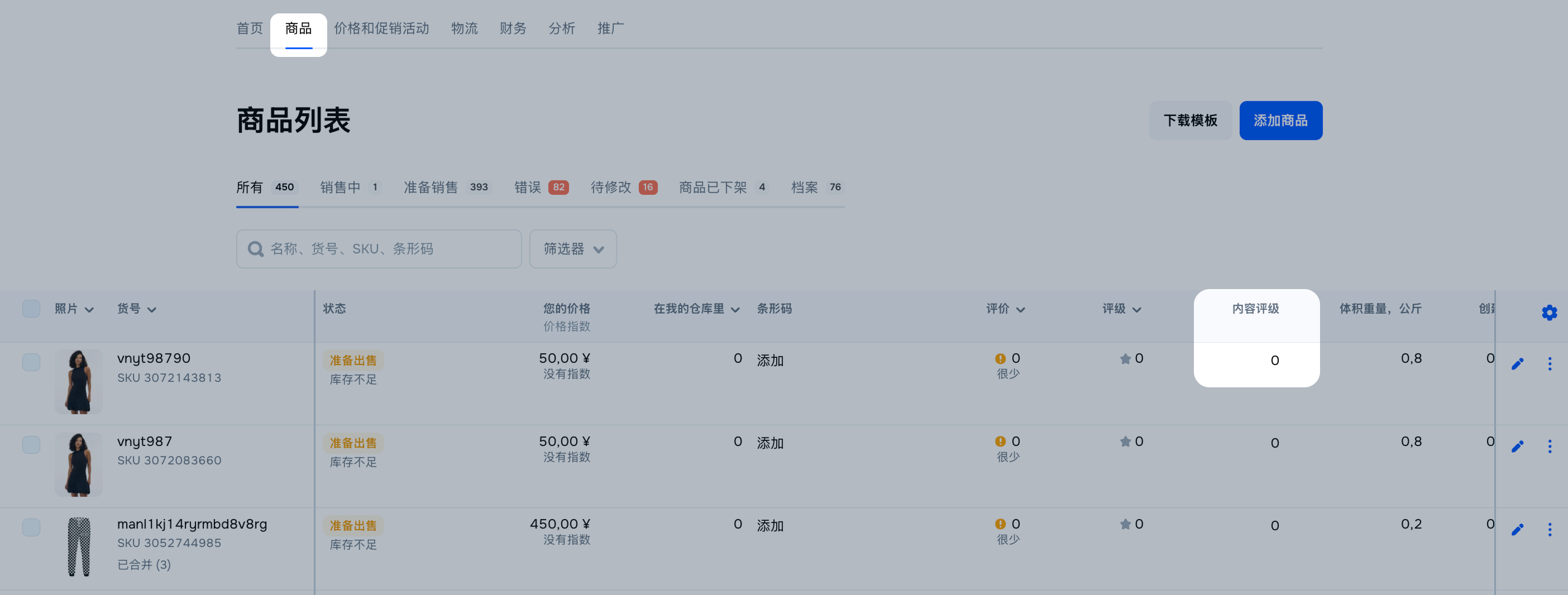 内容评级是填写商品可选特征的建议,这将有助于使其对买家更具吸引力。 评级越高,买家选择您的商品的可能性就越高。