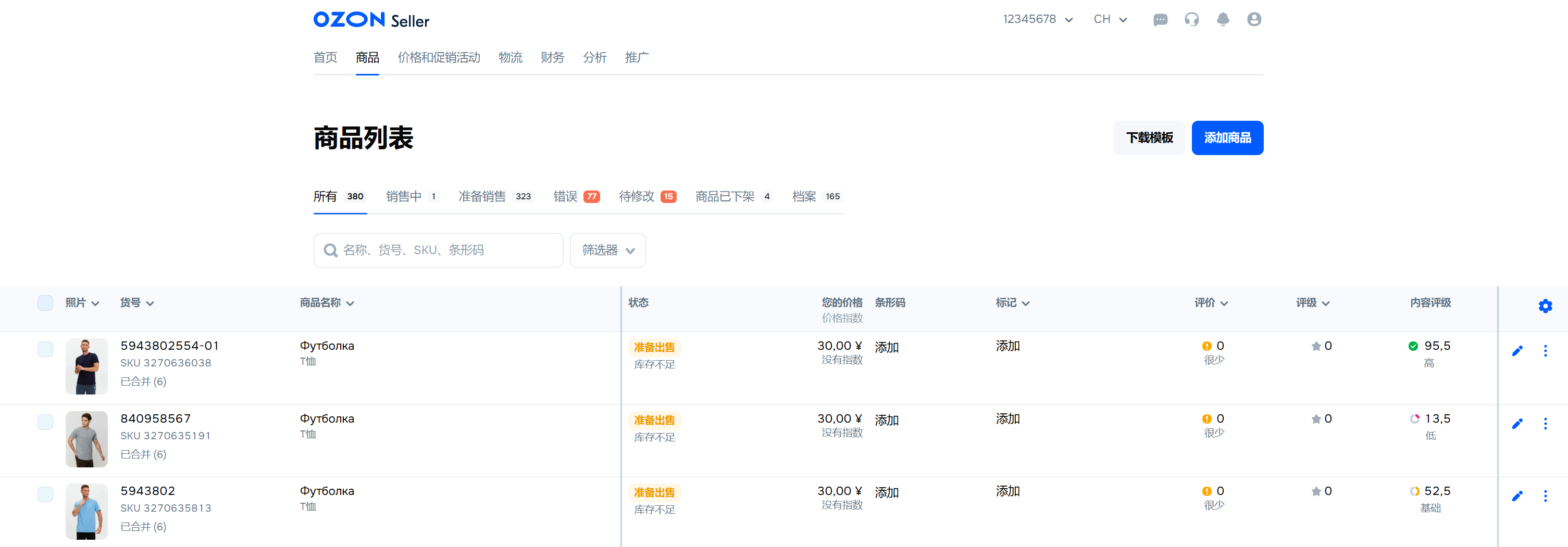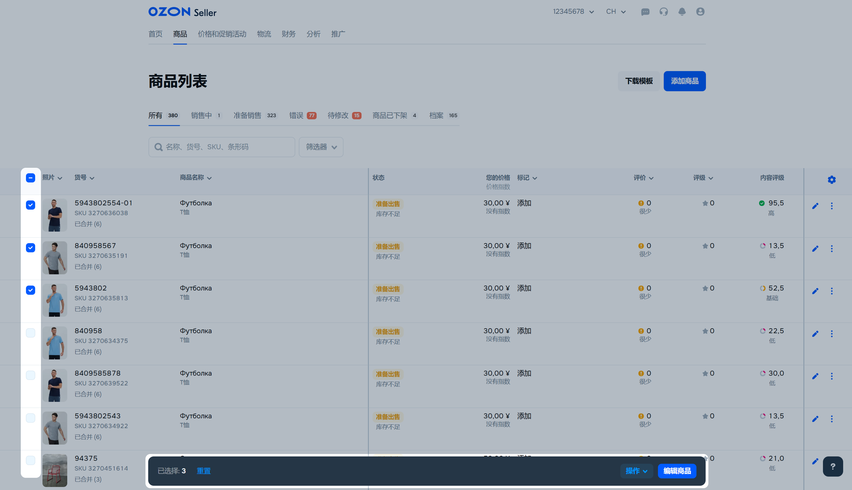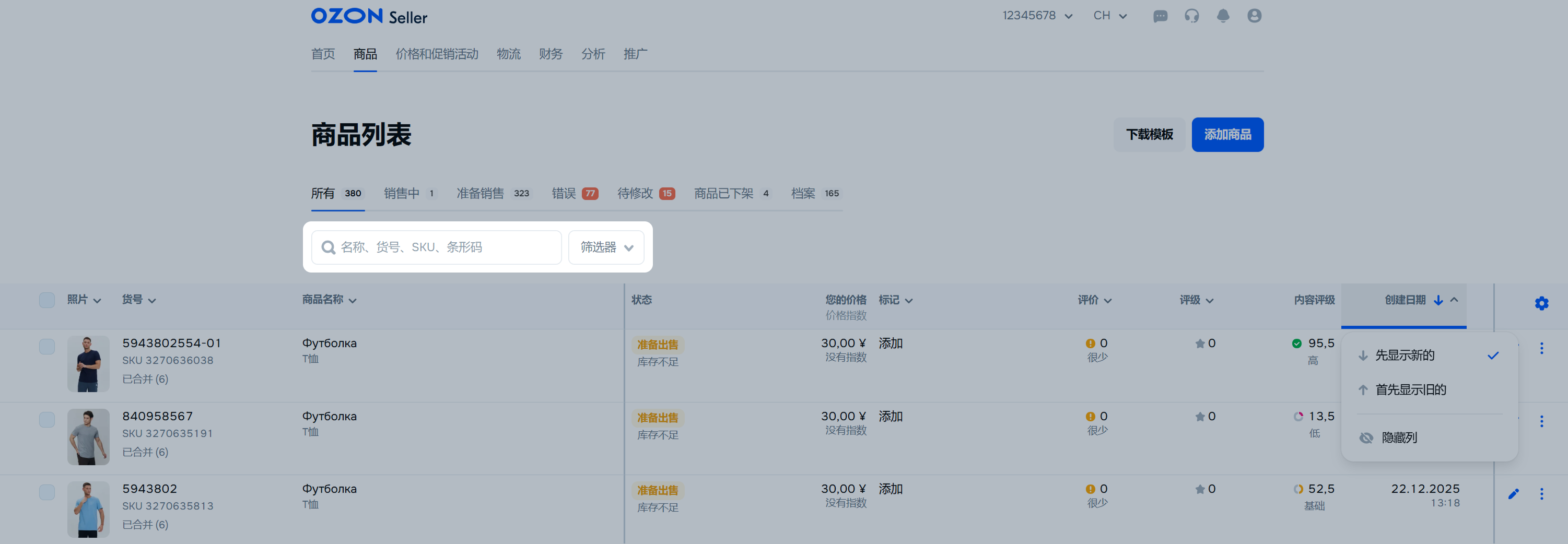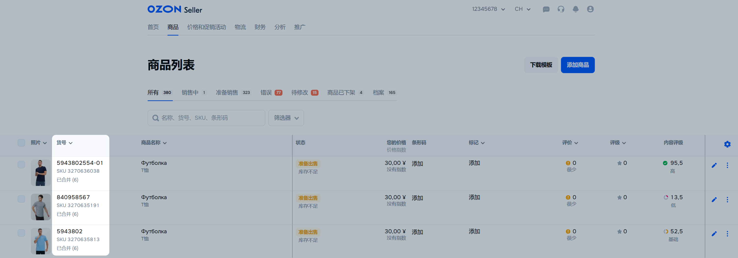 每个商品都有Ozon SKU ID。他的可以在“货号”列中找到。
