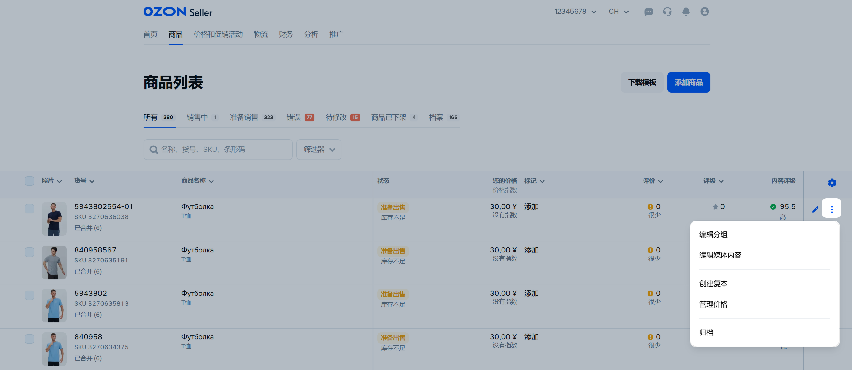 编辑组 — 编辑具有不同特性的同一型号的所有商品。例如,将不同颜色的手机壳合并在一个商品卡片中。