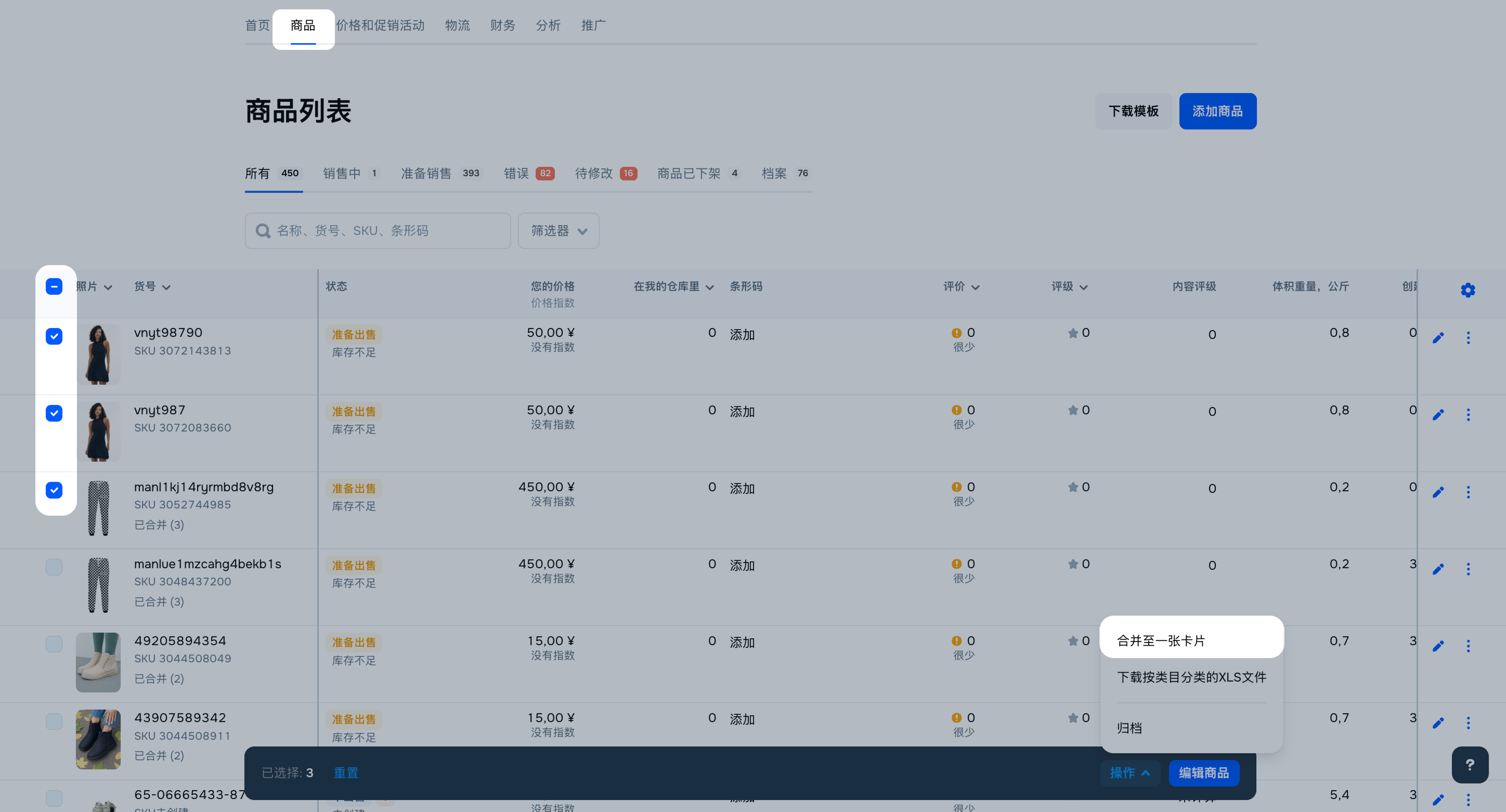 在 合并商品 页面,会显示该卡片下所有变体。您可以: