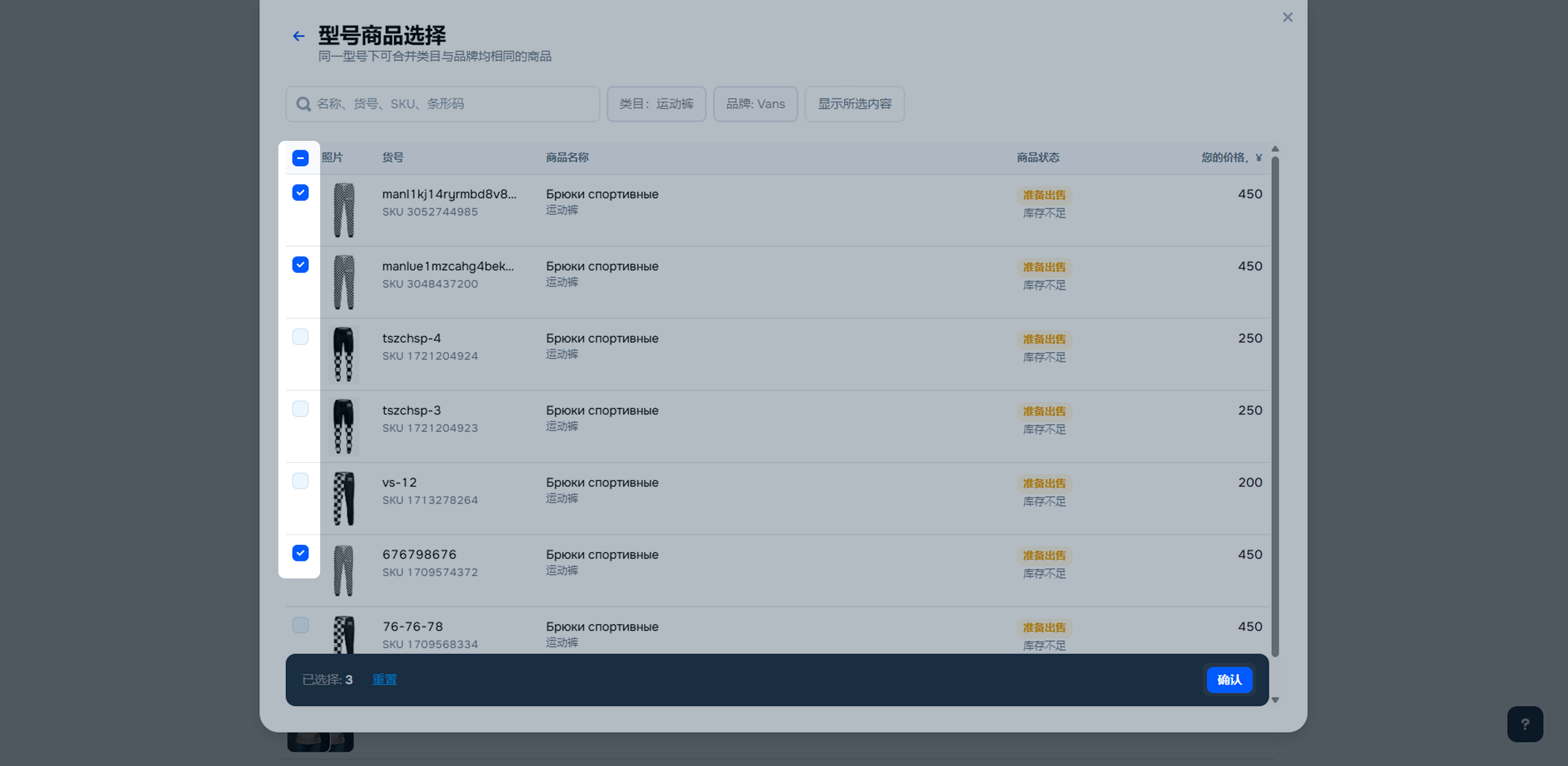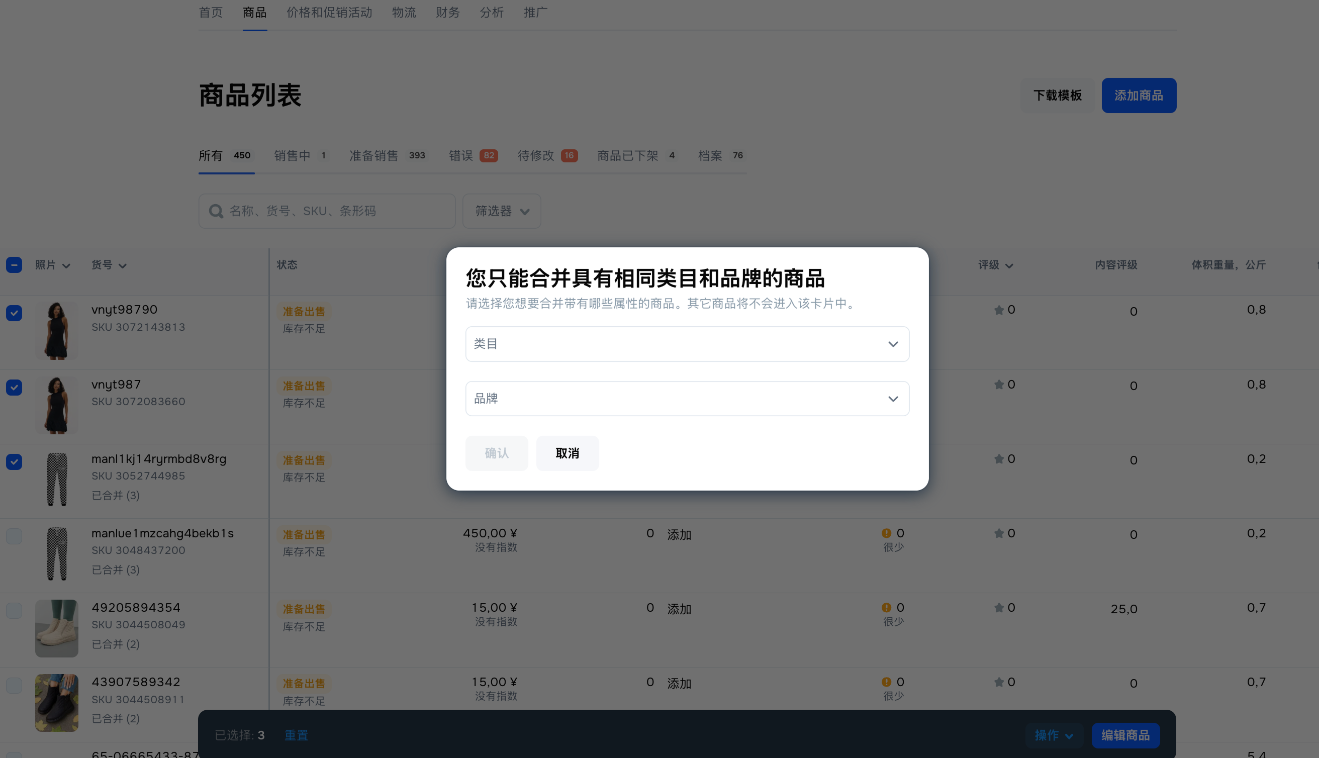 勾选想要合并的商品。选择某个商品后,列表会自动筛选,只保留同品牌和同类目的商品。