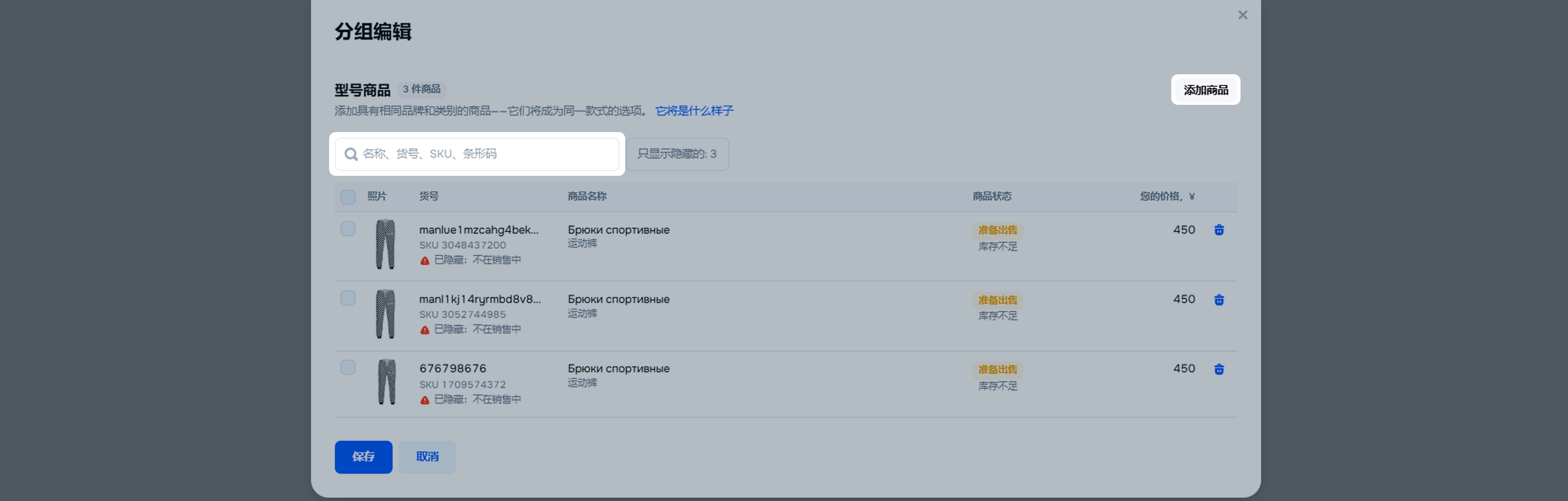 在打开的表格分组创建中,您可以查看将被合并到型号中的商品。如需移除多余商品,请点击