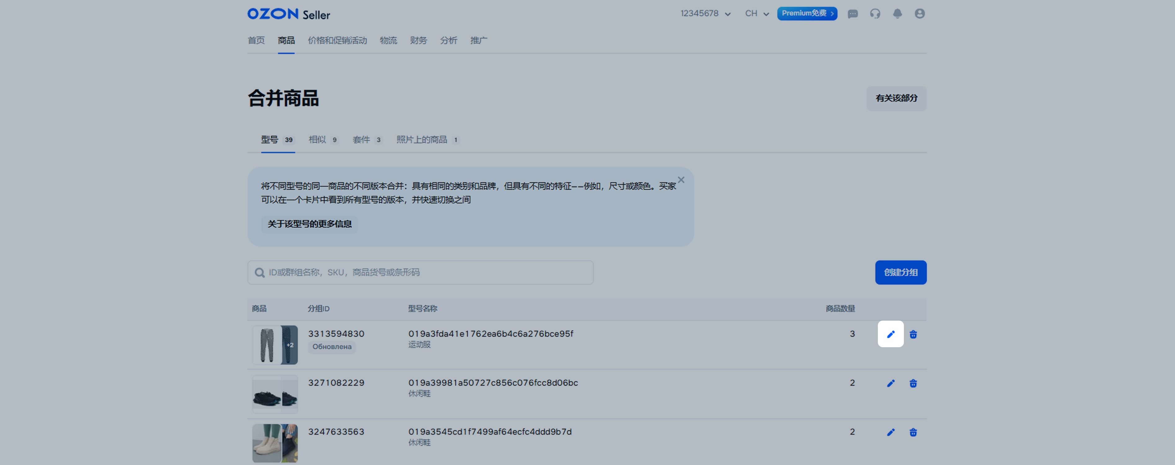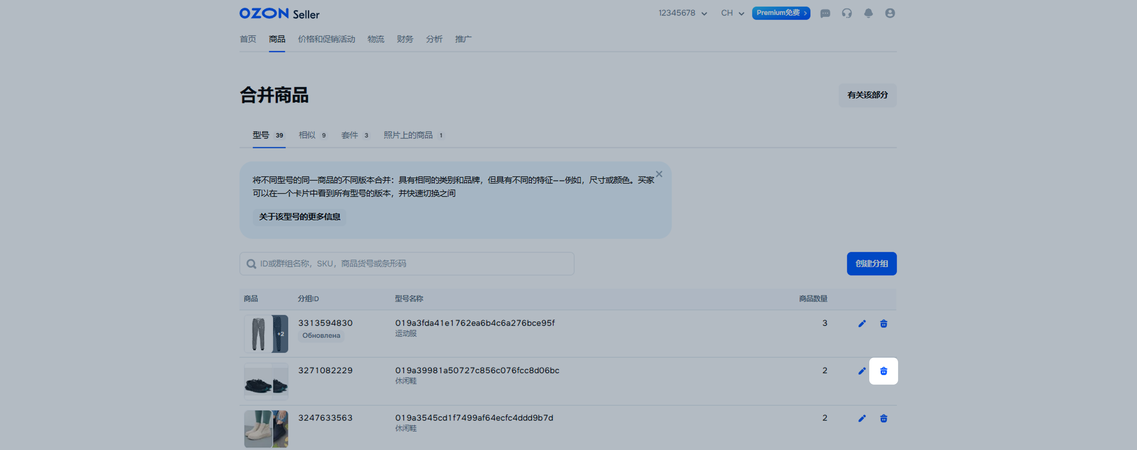 您也可以主动将商品从合并组中移除,操作路径为:商品 → 合并商品。 在 型号 选项卡,找到需要移除商品的分组行,点击