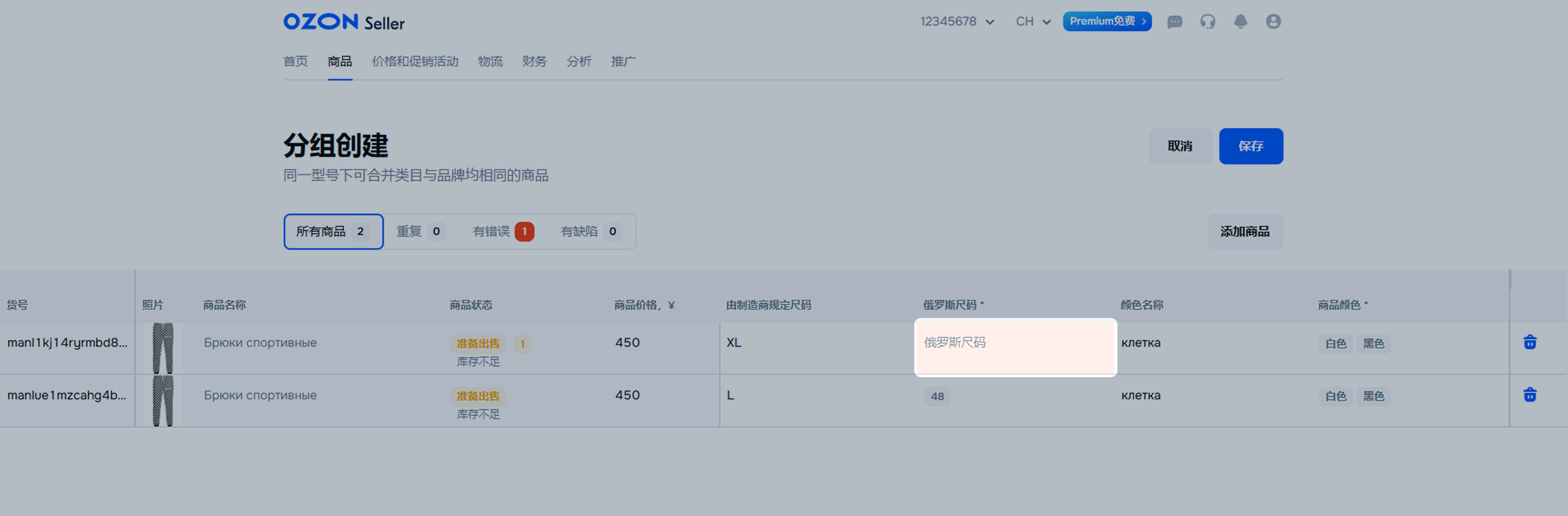 点击 创建分组 → 添加商品。输入商品名称、货号、SKU 或条形码。也可以通过类目和品牌进行筛选。