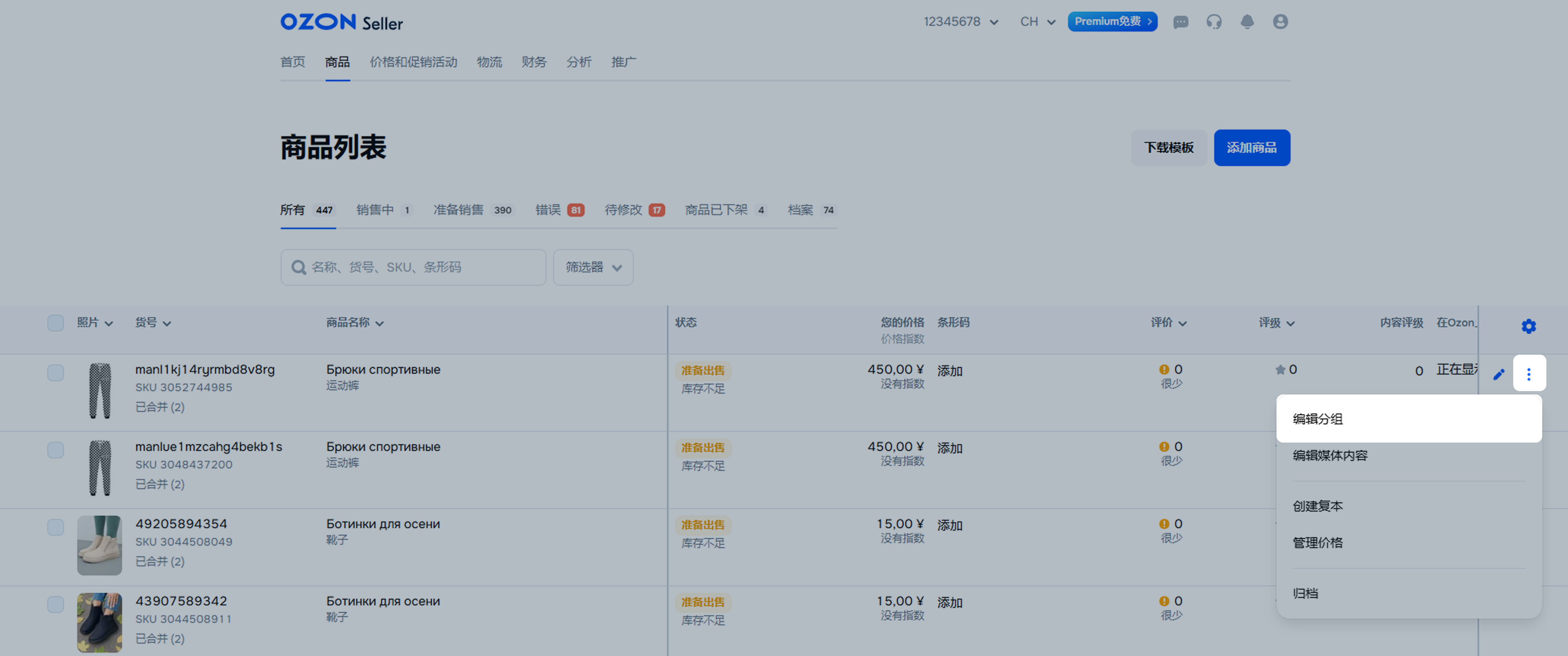 在需要编辑的商品卡片中任意商品变体旁,点击