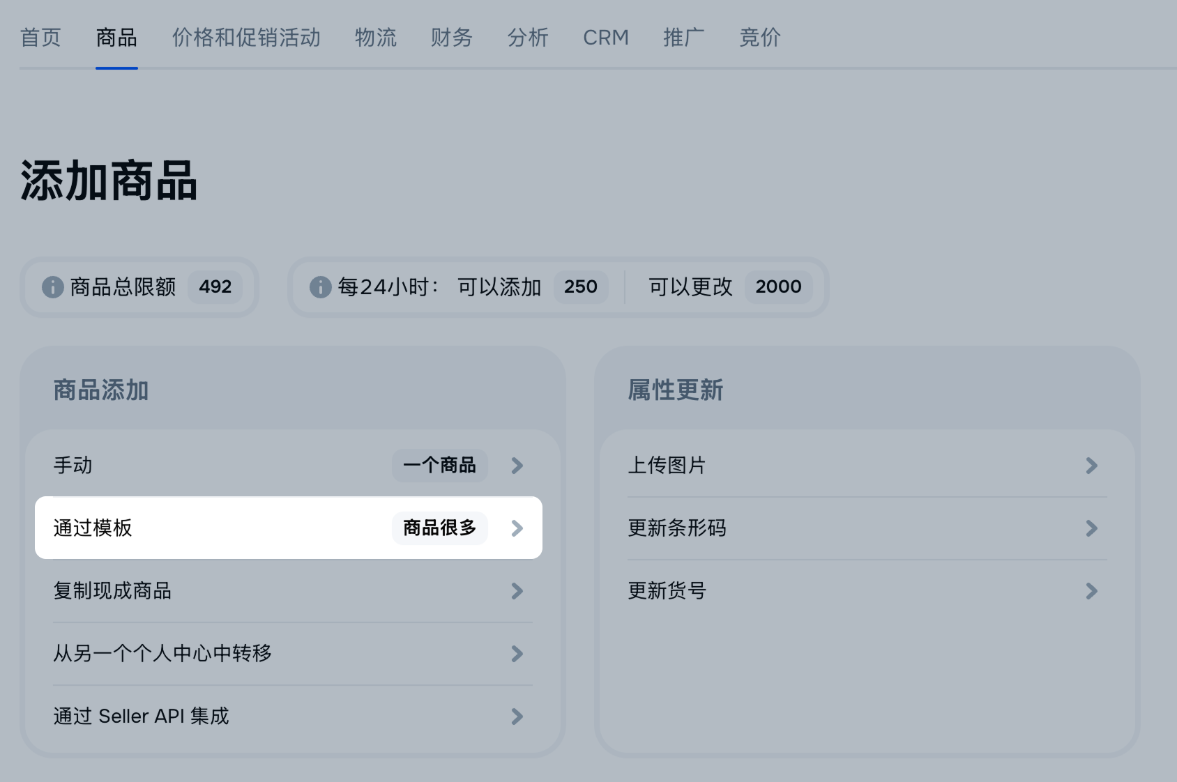 在另一个个人中心中转到 商品 → 添加商品 → 通过模板 部分。