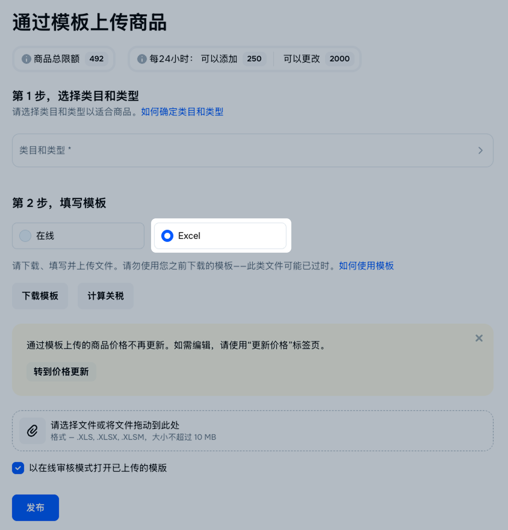 请在填写模板区块中点击Excel。选择从另一个个人中心下载的模板,然后点击发布。对所有下载的模板重复此步骤。