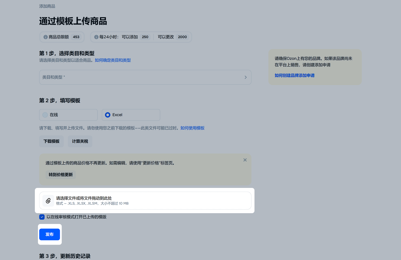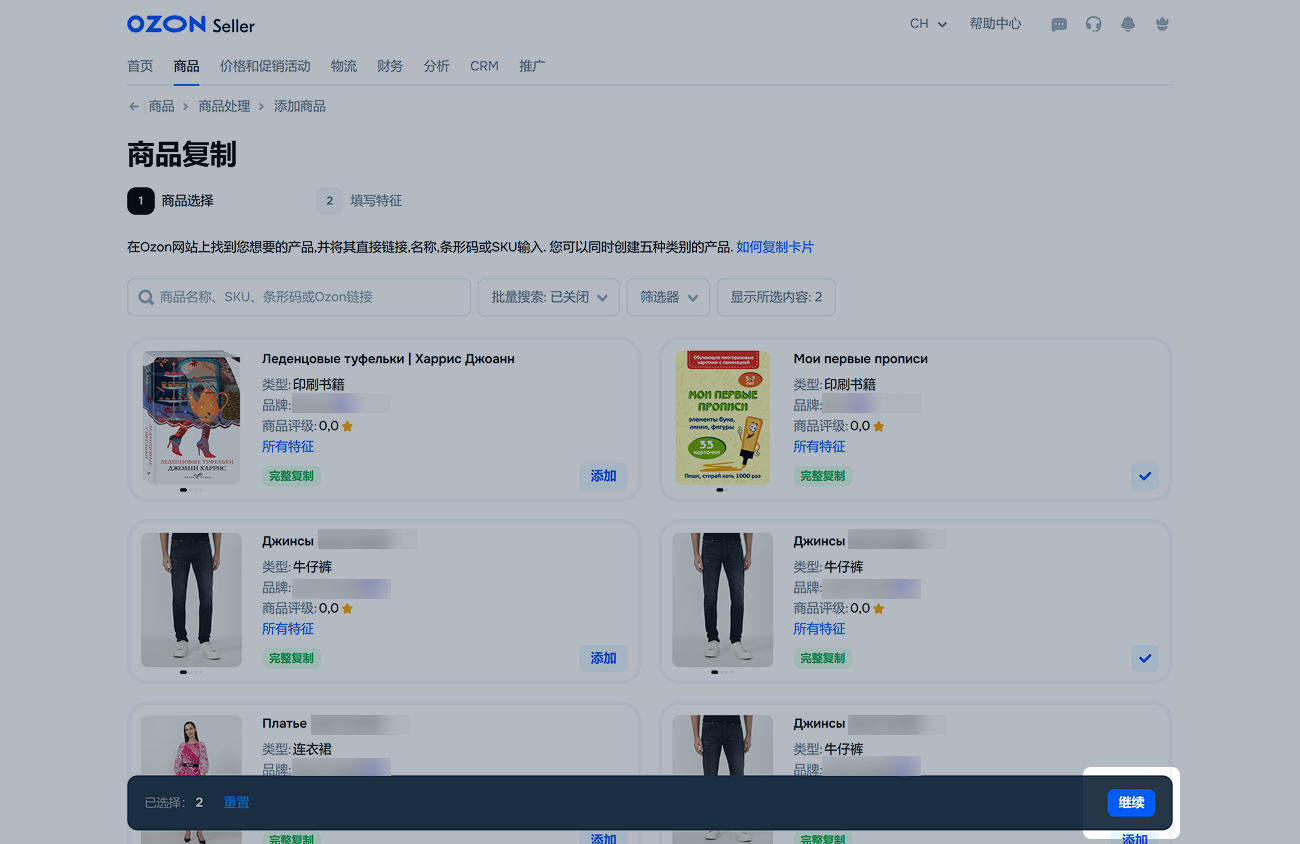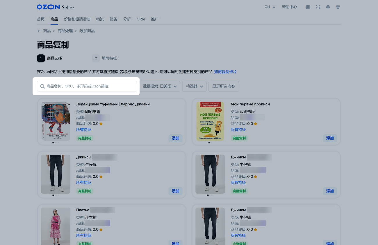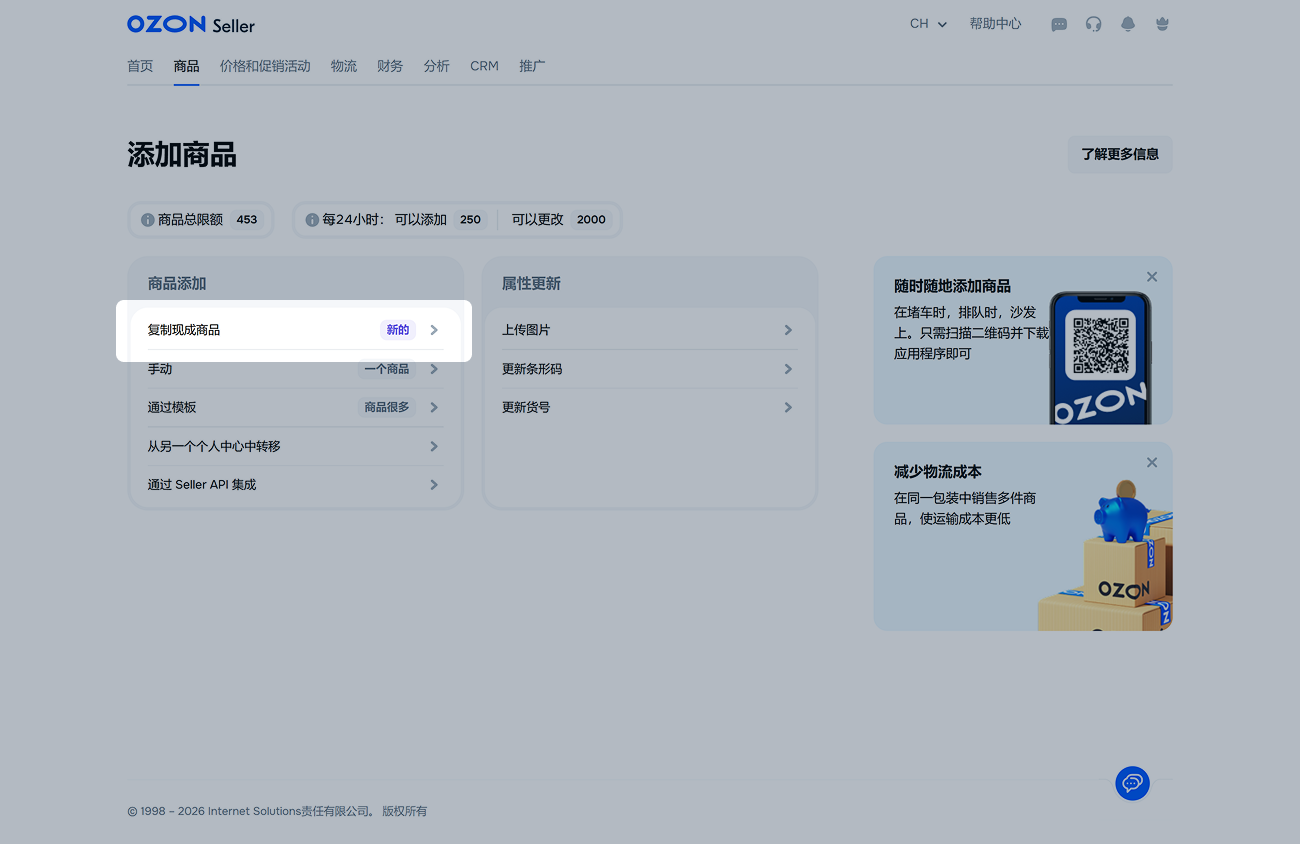 如需通过API复制商品,请使用/v1/product/import-by-sku方法。该方法只能复制其他卖家的商品卡片,无法复制您自己的商品。对于商品数量较多的卖家,建议使用API。