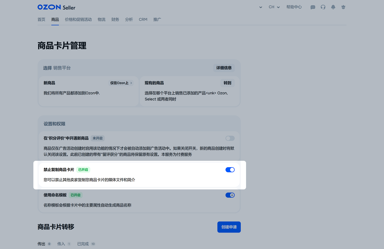 如需禁止其他卖家通过 Ozon 内部工具复制您商品卡片中的部分内容,请在商品→商品卡片管理模块中的禁止复制商品卡片字段,点击右侧开关,开关应变为蓝色。