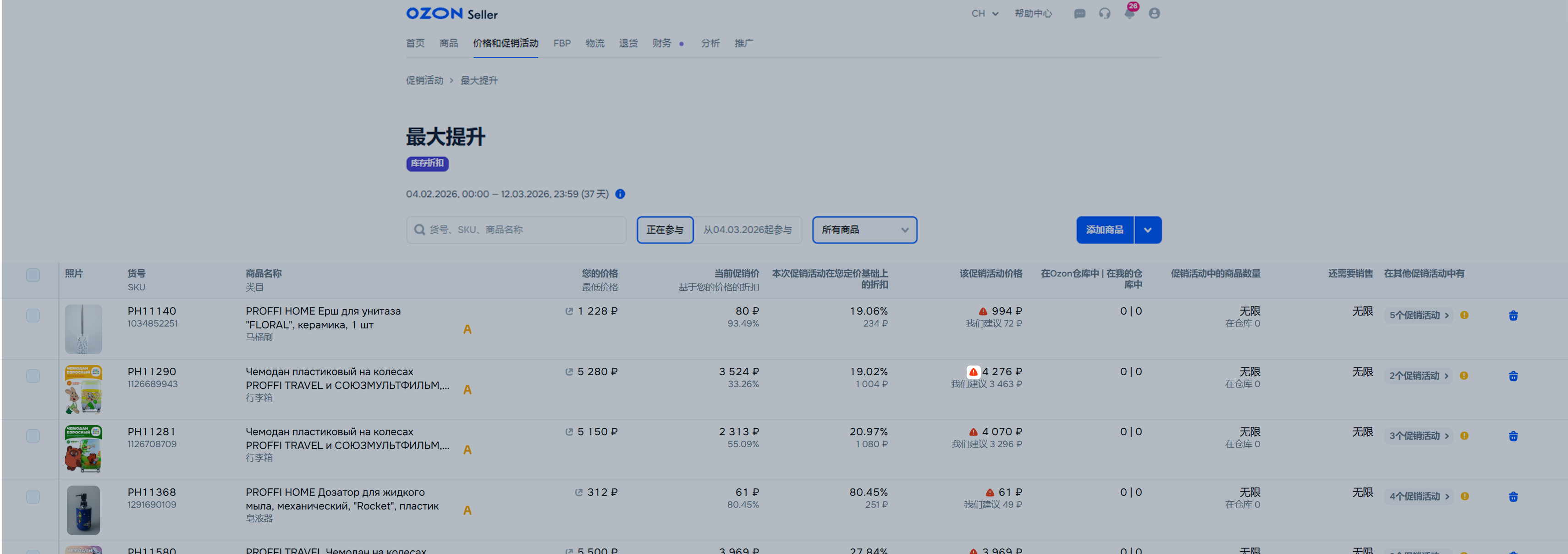 您可以在价格和促销活动 → 来自Ozon的促销活动板块查看商品参与促销活动所需的折扣。