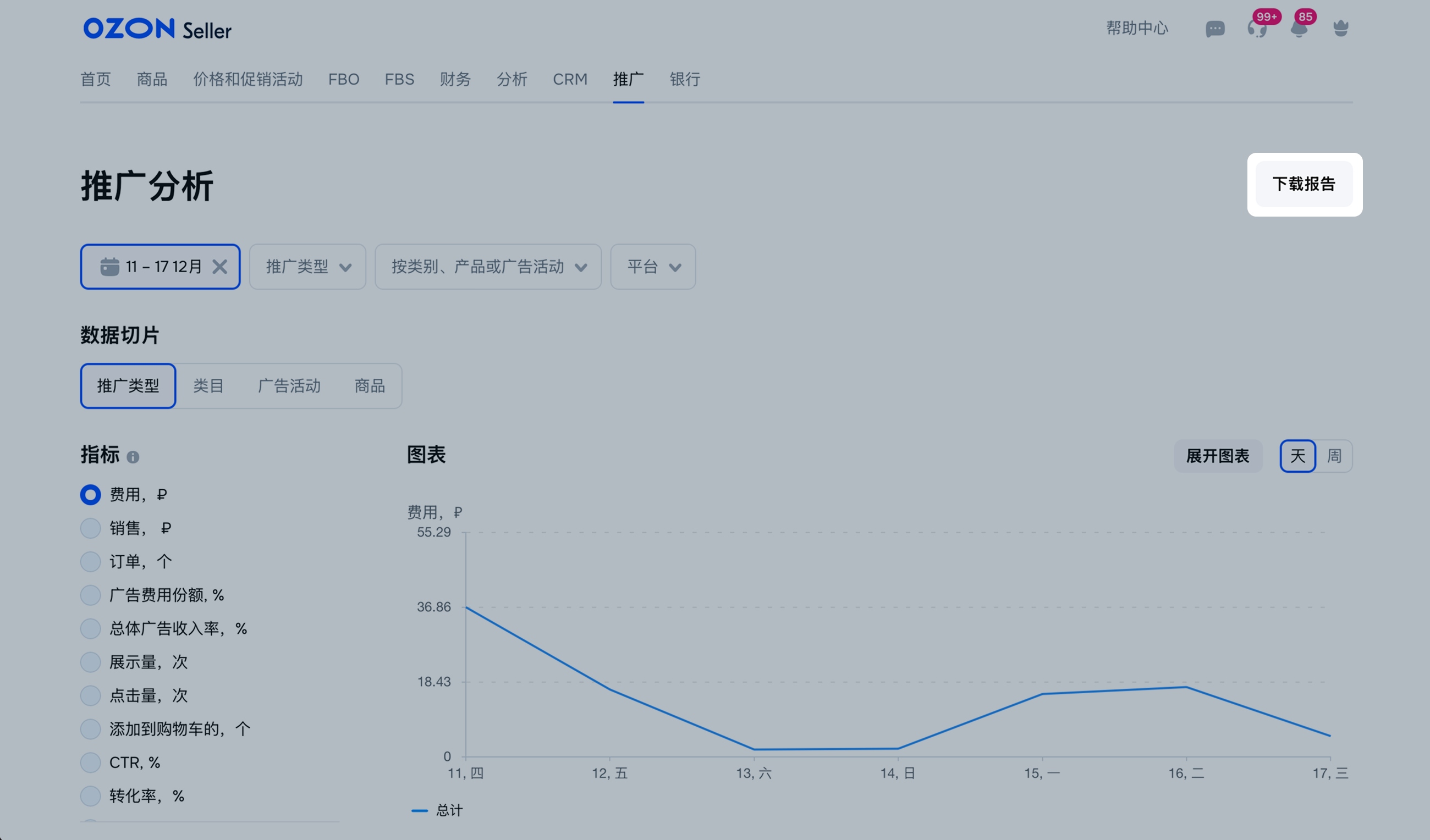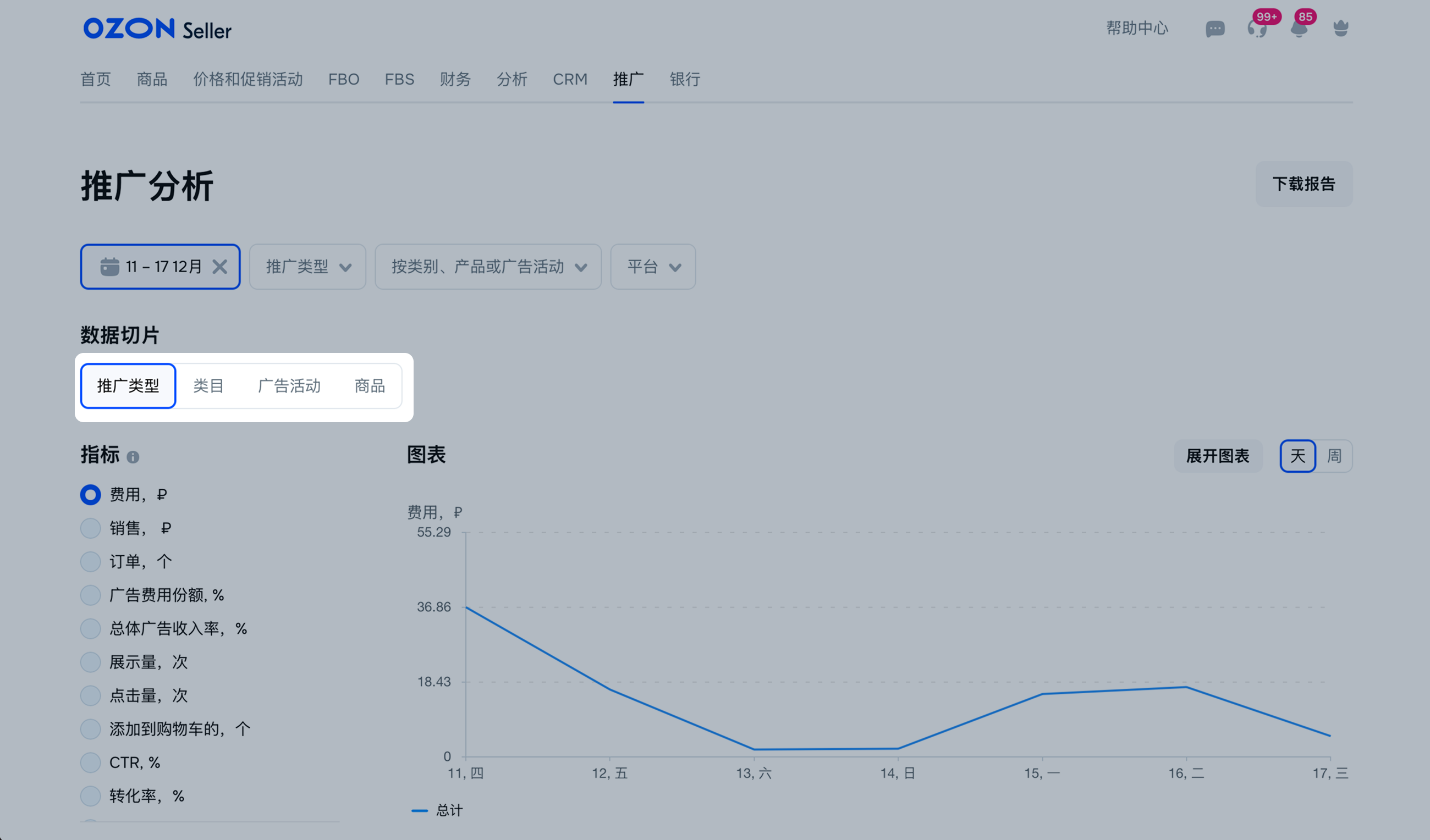 如要评估商品推广绩效并对指标变化快速进行反应,请监控分析。 其中显示特定商品推广或时期内类目推广的数据: