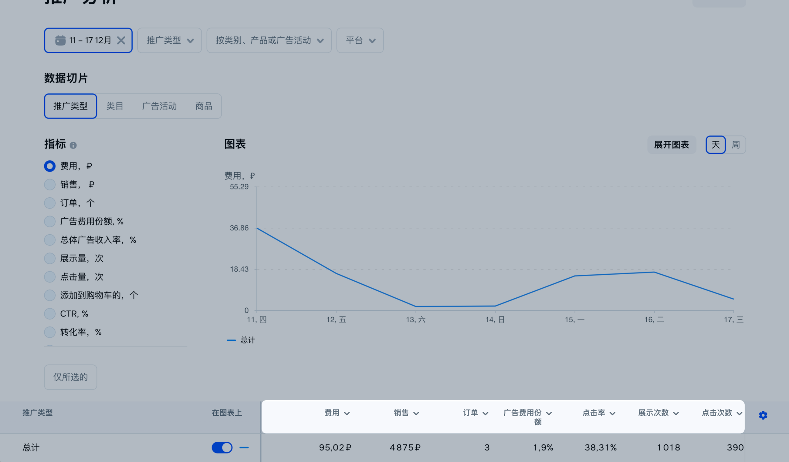 如果在选择的时间段内,您同时在按订单付费和按点击付费的广告活动中推广商品,我们将显示: