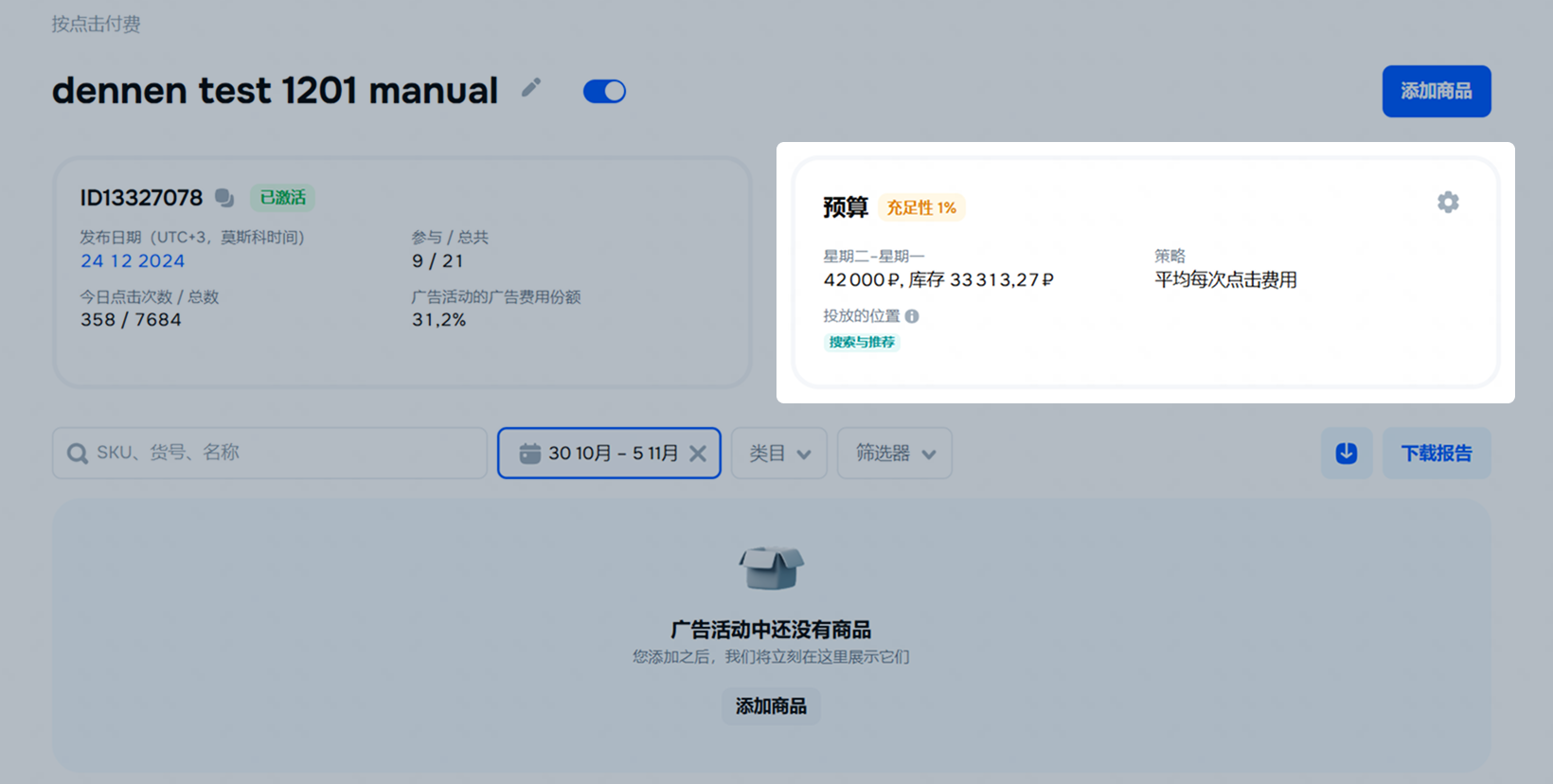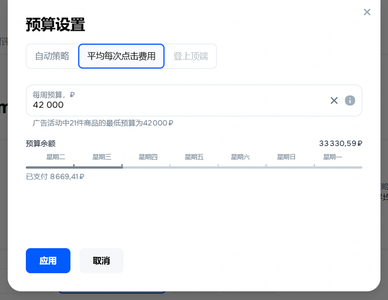 点击次数 × 商品平均出价 × 预计订单数量 × 商品数量 × 周期天数 = 20 × 10 × 2 × 4 × 7 = 11200卢布(每周预算)。