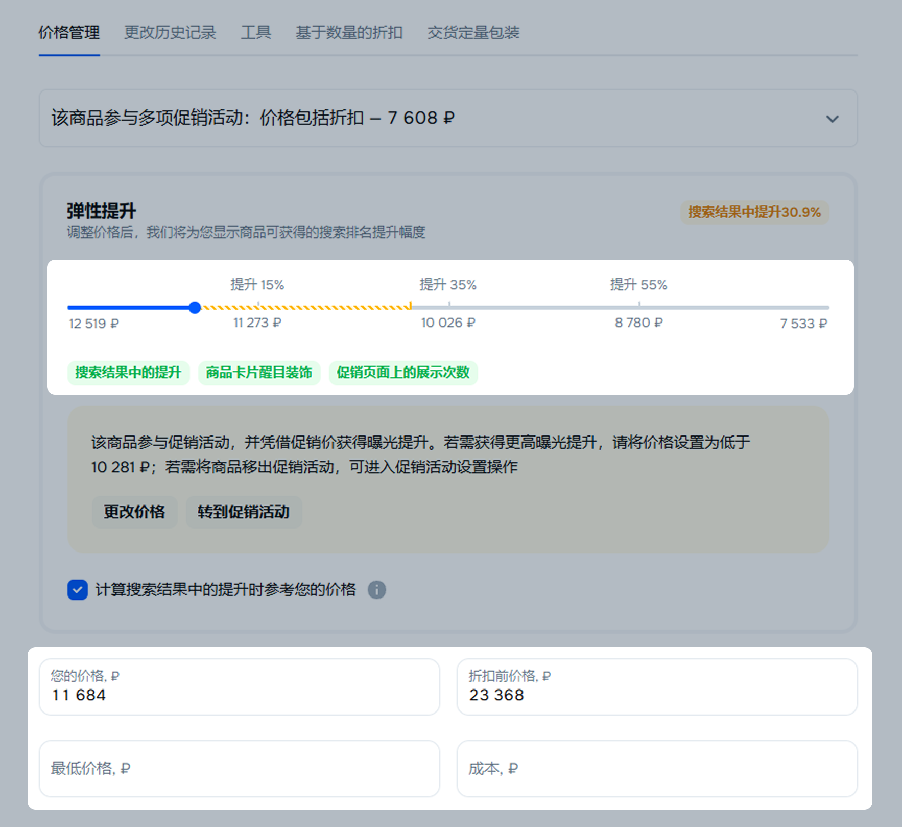 您的商品参与了20天的“弹性提升”促销活动,价格为750卢布,并获得过40%的促销提升。 对于您的商品类目,需要25%的折扣(基于1000卢布的中位数价格)。