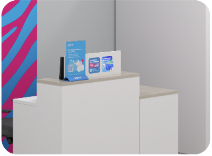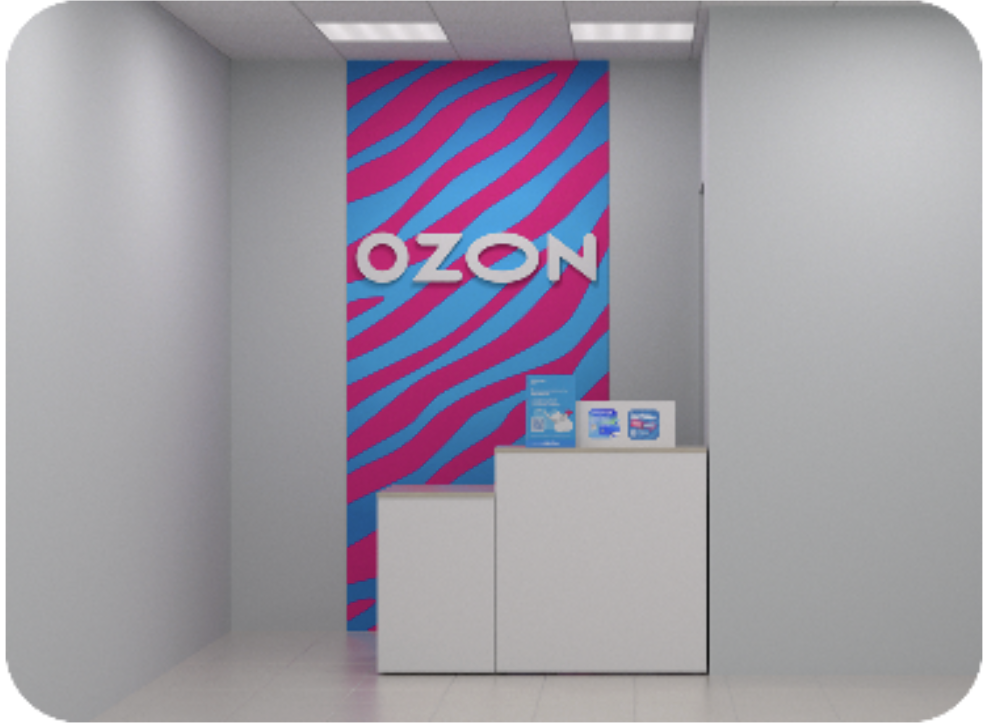 160 × 160 | Разместите стикер на верхней части стойки ресепшен, ближе к стороне, где сотрудник выдаёт заказы, слева от стикера Ozon Банк «Товары за 1 рубль». |