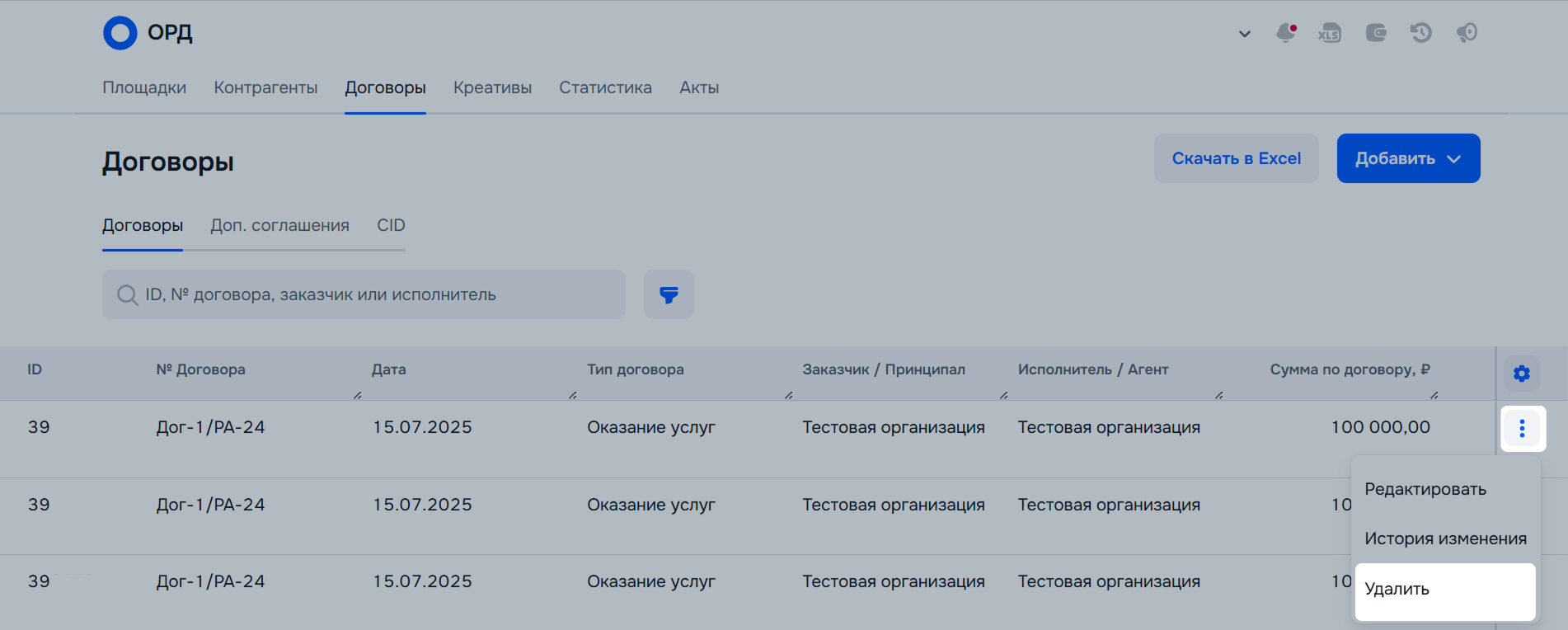 Владелец или администраторы кабинета ОРД могут удалить данные из каждого его раздела.