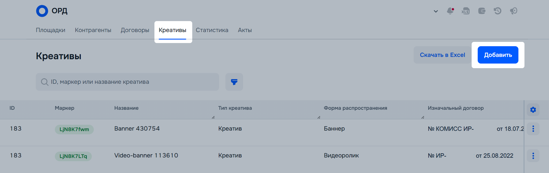 При регистрации креатива участниками рынка Ozon присваивает ему уникальный идентификатор, который будет храниться в базе данных ОРД.