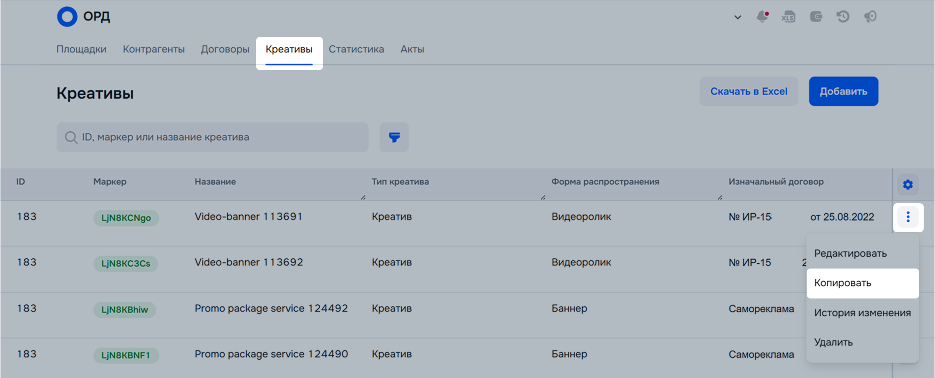 При добавлении нескольких схожих креативов вы можете скопировать существующий, чтобы не заполнять информацию заново. В разделе Креативы напротив креатива нажмите